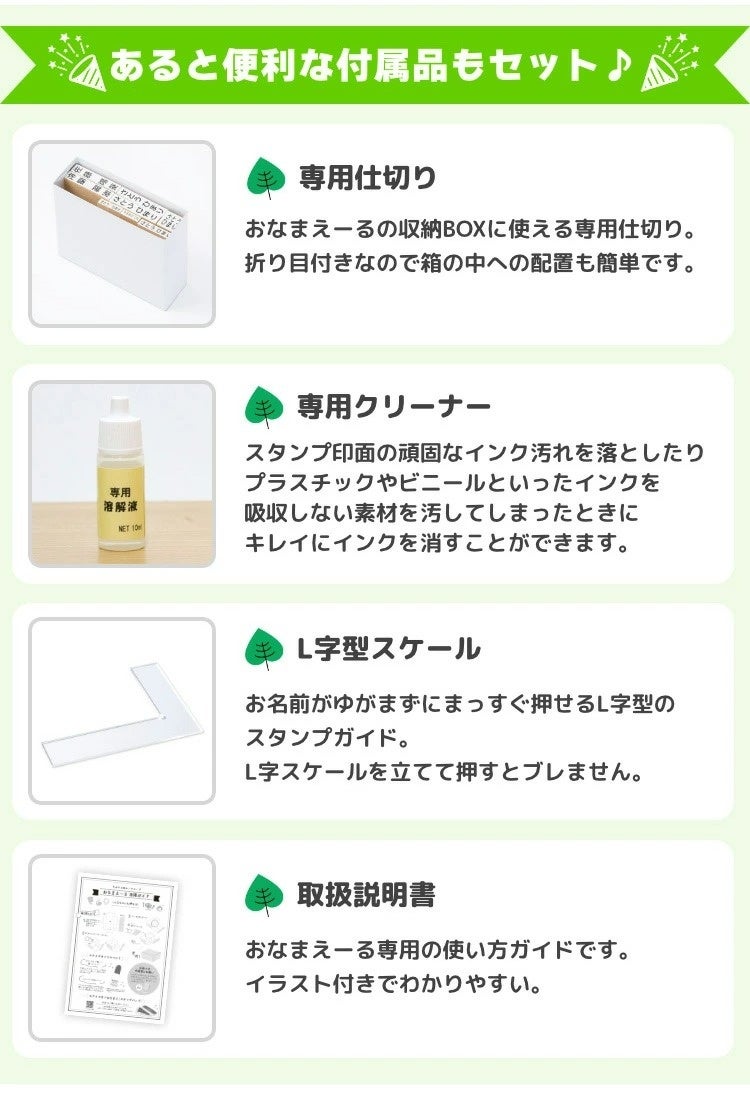 万が一スタンプを失敗したときにインクを消したり(プラスチック・ビニールなどの非吸収面に限る)スタンプの印面のインク汚れをキレイに落とせる専用クリーナーや、お名前をまっすぐ押せるL字スケールなどもセット。お名前つけに必要なものがすべて入ったオールインワンセットとなります。