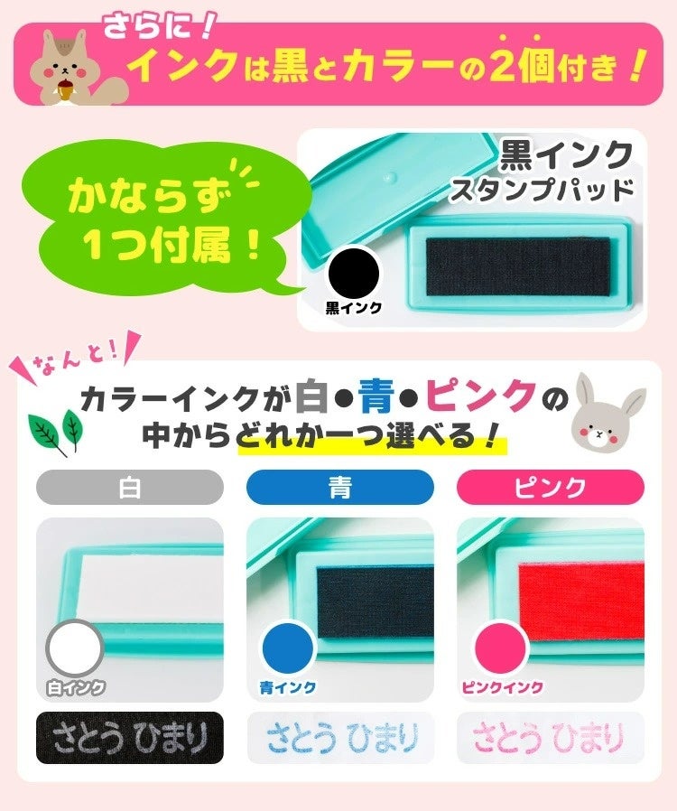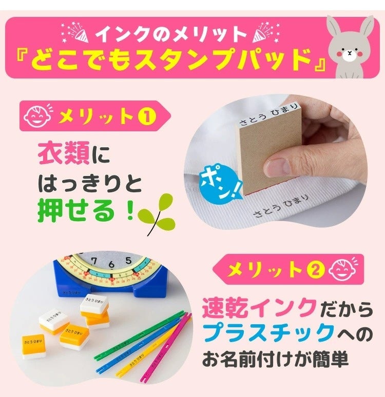 - 布やプラスチックなどさまざまな素材に押せる速乾インク付き!