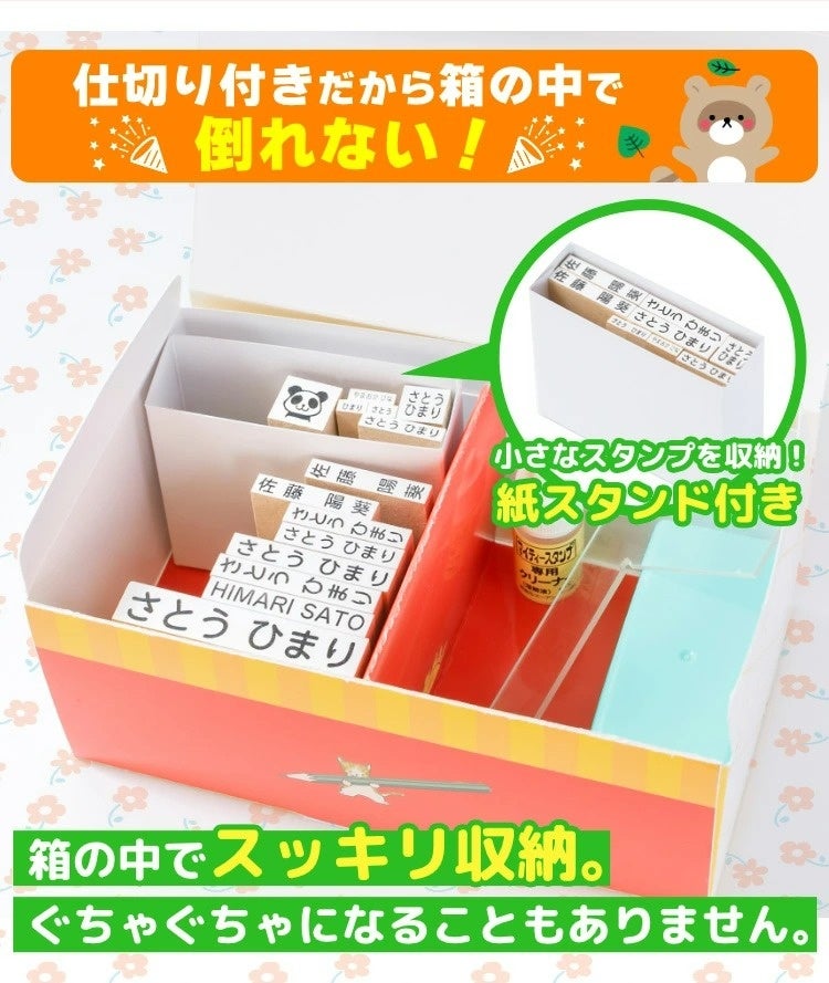 収納BOXには仕切りや厚紙製のスタンドもついており、箱の中でスタンプが倒れることなく、スッキリと収納できるのもポイントです。