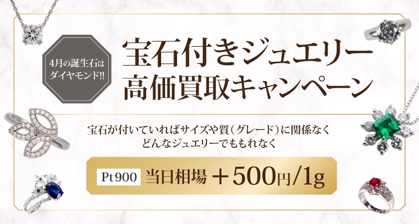 キャンペーン企画の中で、当初は4月の誕生石であるダイヤモンドの買取キャンペーンをご用意しておりましたが、対象商品が絞られてしまうため、今回は思い切ってすべての石をキャンペーンに適用することにいたしました。石付きのPt900製品であれば石の質や種類にかかわりなく、Pt900の「当日相場+500円/1g」にてお買取りさせていただきます。もちろん石のお値段などもきちんとお出ししてお値段出しさせていただきますので、プラチナに上乗せしたお買取り金額分がそのままお得になる仕様となっております。