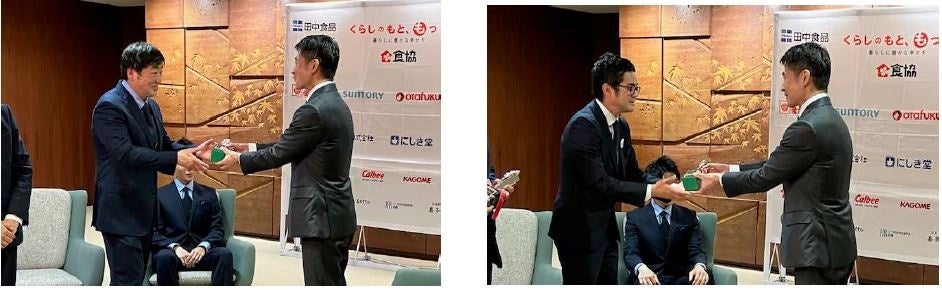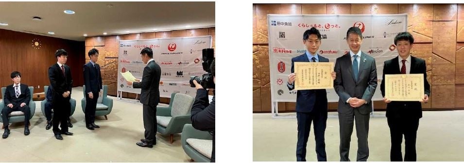 また若手料理人の育成には、店舗の協力が不可欠であることから令和3年度から店舗表彰も開始しました。成績優秀者を輩出した店舗を代表して、ラ・セッテオーナーシェフの北村英紀(ひでのり)さんと、広島ガーデンパレスの営業係長鎧坂知享(よろいさか ともゆき)さんにトロフィーを授与しました。