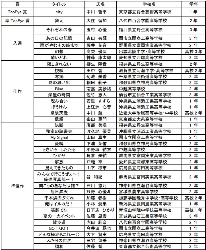 ニコンイメージングジャパンは、1979年より写真部で活動する中学、高校生の皆さまの写真生活応援マガジン「TopEye」を発行しています。創刊当時から中学・高校生の皆さまを対象に年に1回、「TopEyeフォトコンテスト」を行っており、「2022年TopEyeフォトコンテスト」には、全国の中学・高校生から約1,200点の応募が寄せられ、写真家の熊切大輔氏と藤岡亜弥氏による厳正なる審査によって、「TopEye賞」および「入賞作品」を決定しました。