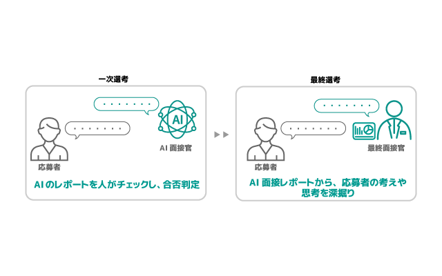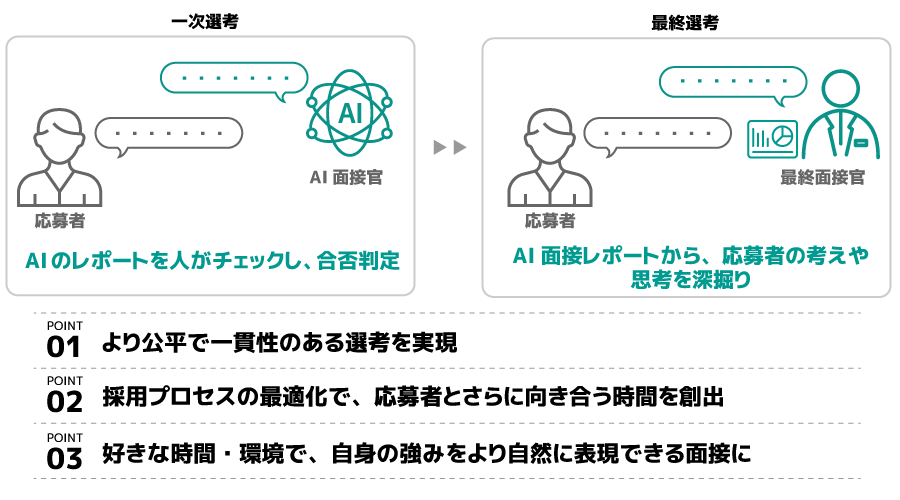 また、 AI面接は、あくまで選考の質を高めるための補助材料と考えており、一次選考の合否については、AIの分析レポート結果を採用担当者が確認したうえで判断します。加えて、当社従業員とのコミュニケーション機会によって相互理解を深め、当社の風土を実感していただくことを重視しています。