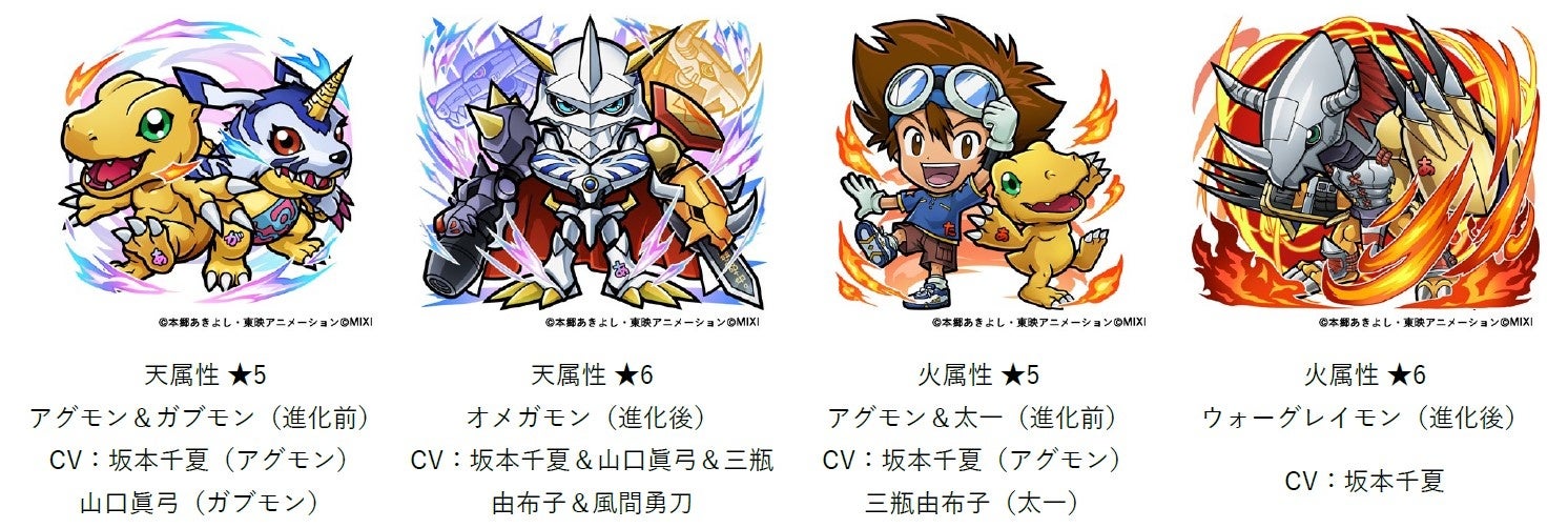 コラボ召喚には、「オメガモン」をはじめ、「ウォーグレイモン」「メタルガルルモン」「ガルダモン」「アトラーカブテリモン」「ズドモン」「リリモン」「コロモン」が登場します。また、コラボ開催期間中にログインした方全員に「ブイモン&大輔」を1体プレゼントします。