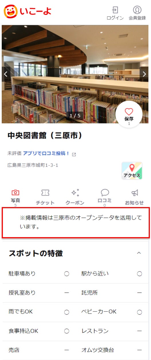 2024年8月より、広島県三原市の「子どもとおでかけ向け」施設のオープンデータを利用しています。データは「いこーよ」サイトおよびスマホ向けアプリの「おでかけ」情報欄に掲載され、どなたでも無料でサービスをご利用いただけます。なお、情報欄にはオープンデータを利用している旨が記載されます。