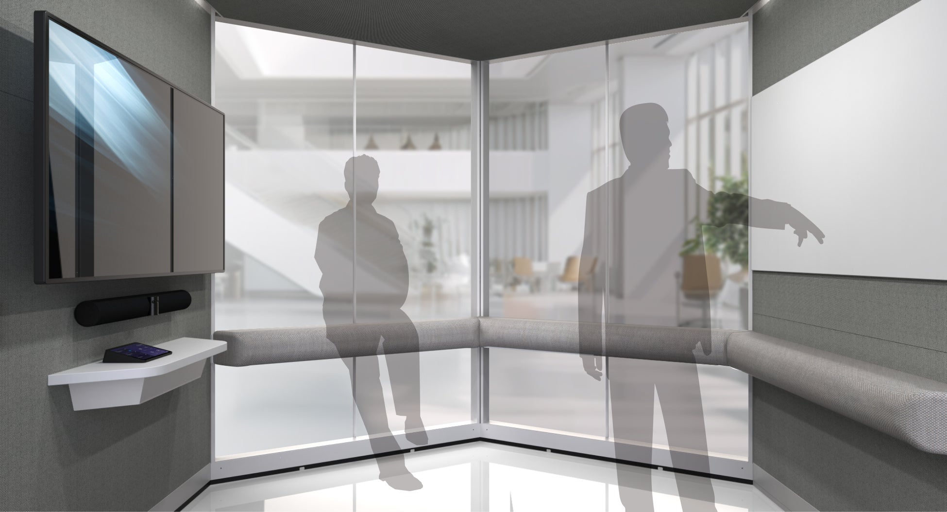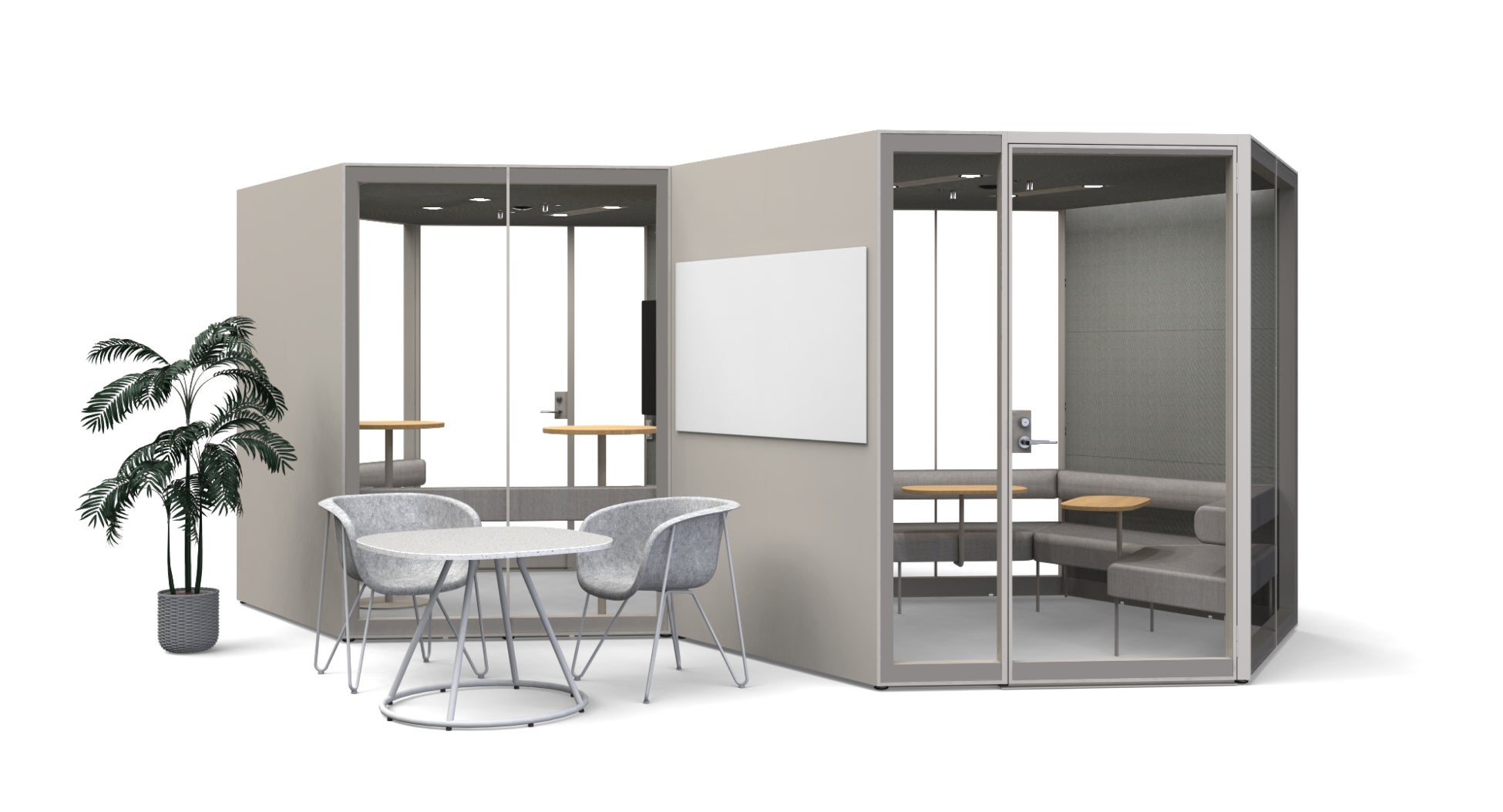 ガラス面を最大化し、抜け感のあるデザインへとアップデートすることで、オフィスの中心へと設置場所の拡張性が高まりました。また、複数台並べたブース外面を活用することで人が集うハドルスペース(一時的なミーティングスペース)としても利用可能です。ホワイトボードはオプションでブース外側にも取り付け可能で、打ち合わせ前後のショートミーティング、ちょっとした作業などに最適なワークスペースを自由に構築でき、オフィスワーカー同士のコミュニケーションを誘発するとともに業務効率を高めます。