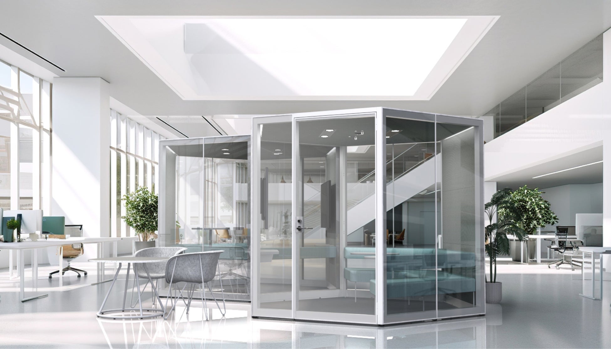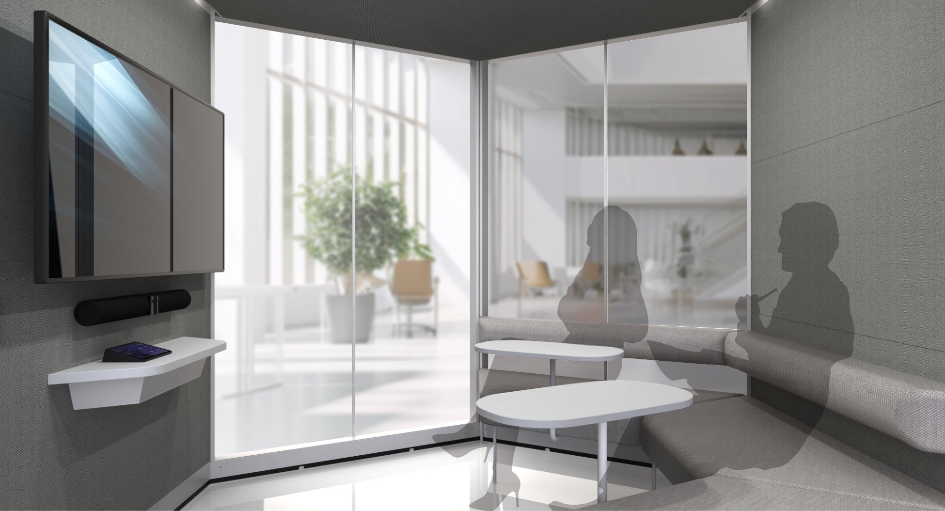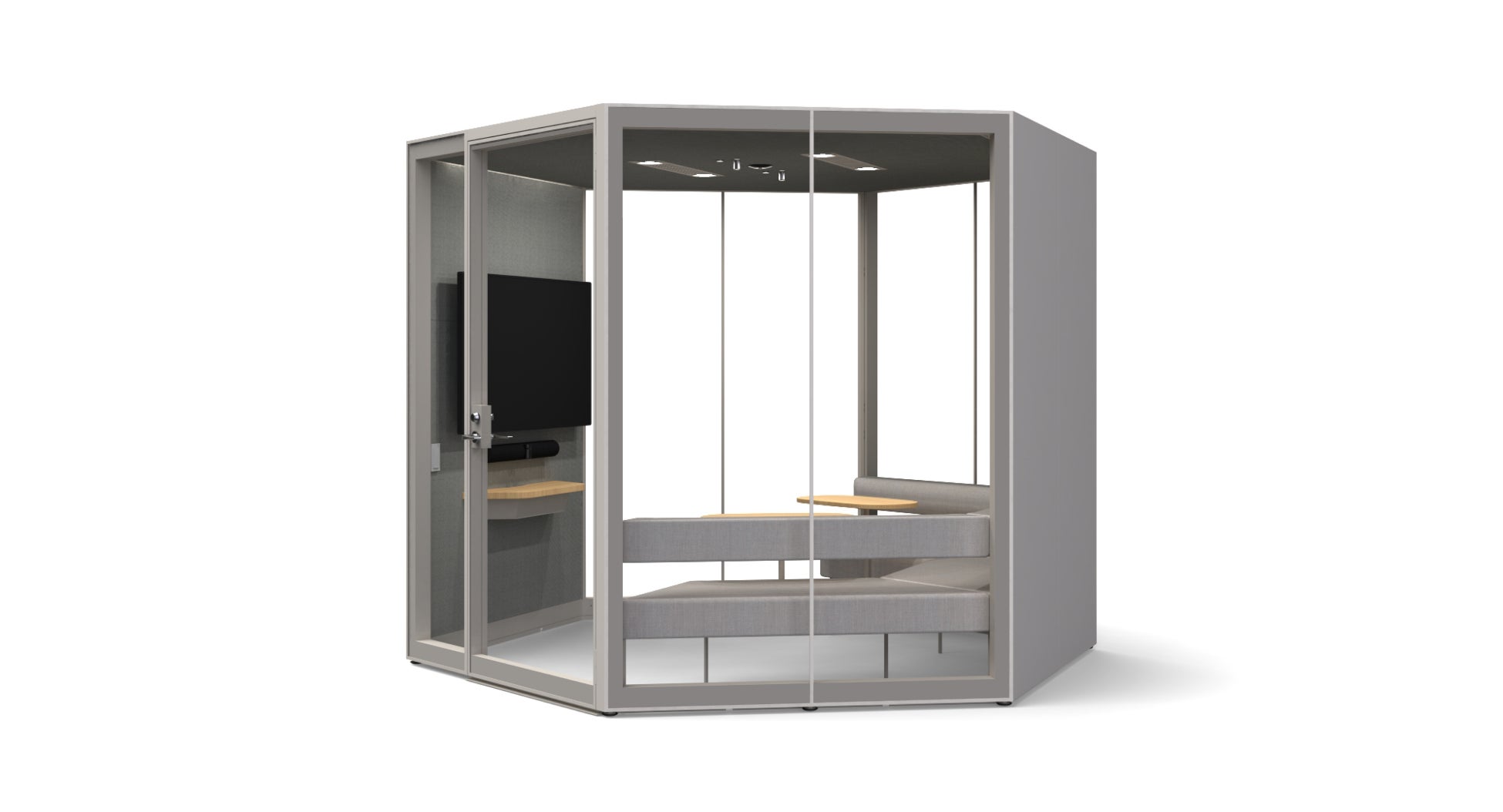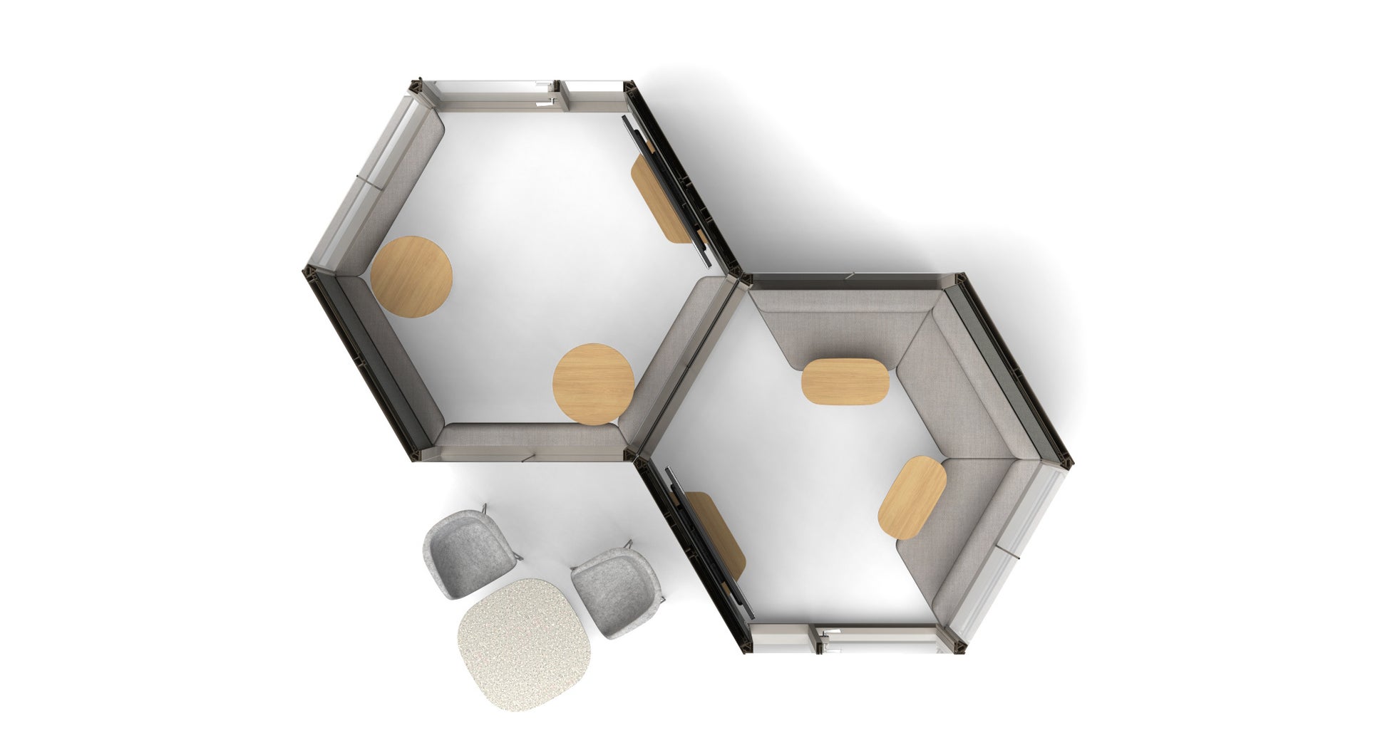 六角形形状を活かしたディスプレイモニターに向き合う座位配置、遮音と吸音に優れた最新型の個室ブースにより、オフィスでの会議室不足やオープンスペースでの音問題を解消し、創造的なチームの協働を実現します。
