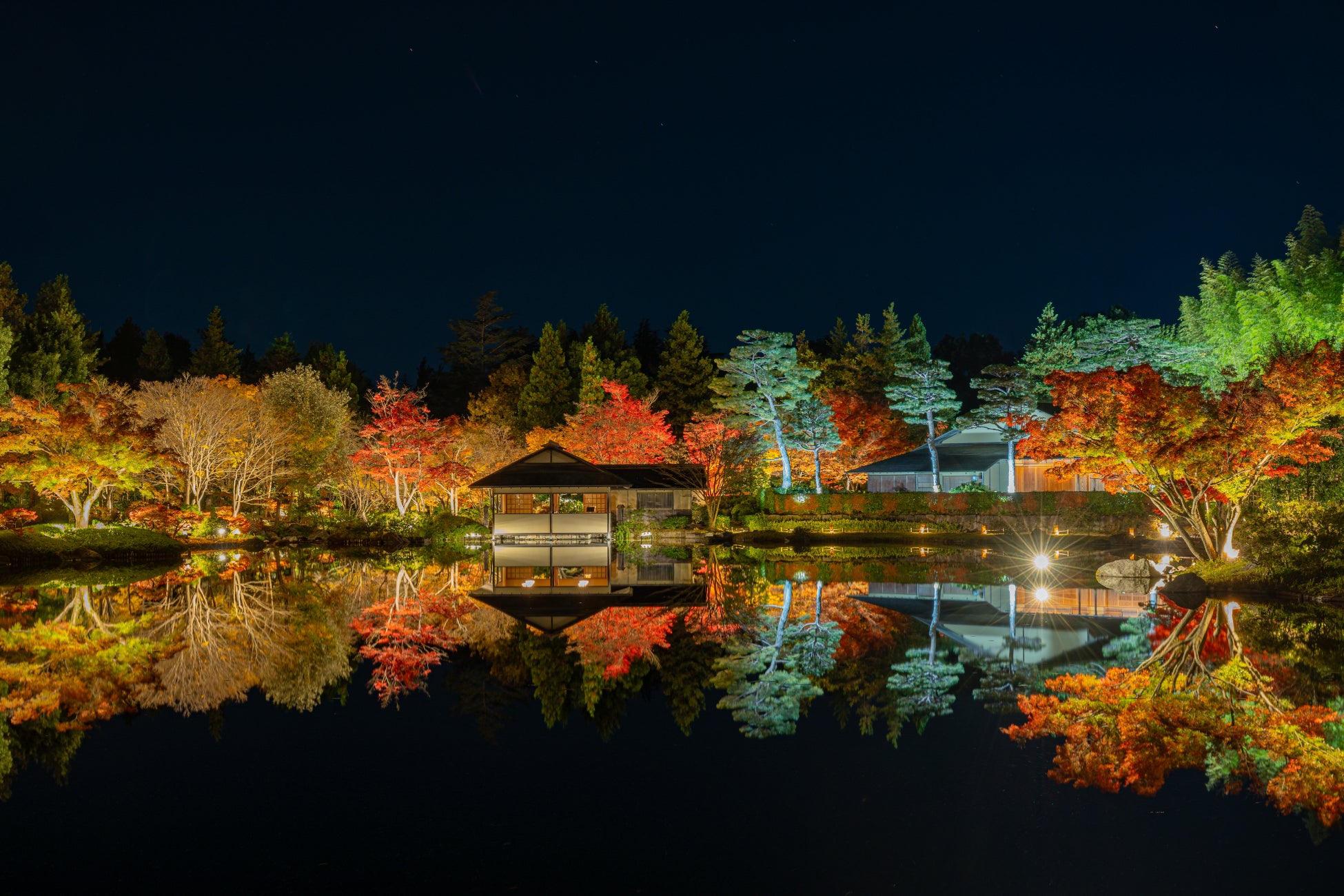 日本庭園やイチョウ並木をライトアップします。赤や黄色に色づいた木々が、園内を鮮やかに彩ります。