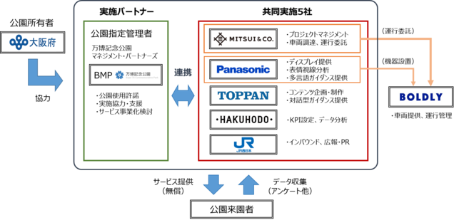 三井物産株式会社(本社;東京都千代田区、社長:安永竜夫、以下「三井物産」)、パナソニック株式会社(本社:大阪府門真市、社長:津賀一宏、以下「パナソニック」)、凸版印刷株式会社(本社:東京都千代田区、社長:麿秀晴、以下「凸版印刷」)、株式会社博報堂(本社:東京都港区、社長:水島正幸、:以下「博報堂」)、西日本旅客鉄道株式会社(本社:大阪府大阪市北区、社長:長谷川一明、以下「JR西日本」)は、万博記念公園マネジメント・パートナーズ(以下、「BMP」)と共に、万博記念公園(大阪府吹田市)にて、自動運転車両を活用した次世代型モビリティサービスの実証試験を共同で実施致します。