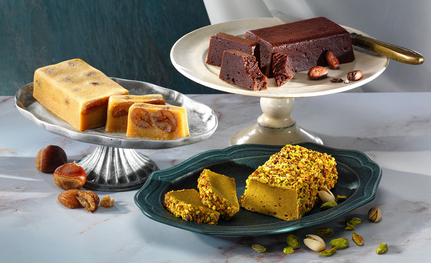 低温でじっくり蒸し焼きし、ずっしりとした重厚感、しっとりとなめらかな食感に仕上げたテリーヌです。[ショコラ]・[ピスターシュ]・[マロン]の3種の味わいを心ゆくまでお楽しみください。
