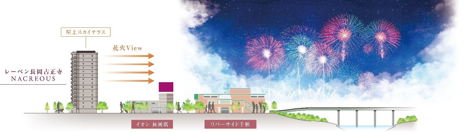 本物件は、リバーサイド千秋をはじめ多彩な商業施設が集積する古正寺エリアに立地しています。「まちなか居住区域」に指定されており、使いやすく暮らしやすい市街地への居住が促進されています。さらに周辺には、千秋が原ふるさとの森公園、ハイブ長岡、長岡赤十字病院、子育ての駅千秋(てくてく)などの医療・公共施設が充実しており、日々の利便と安心を叶えます。また、長岡市の代名詞である「長岡まつり大花火大会」。本物件は全邸東向きのため、お部屋から悠々とダイナミックな花火ビューをお愉しみいただけます。