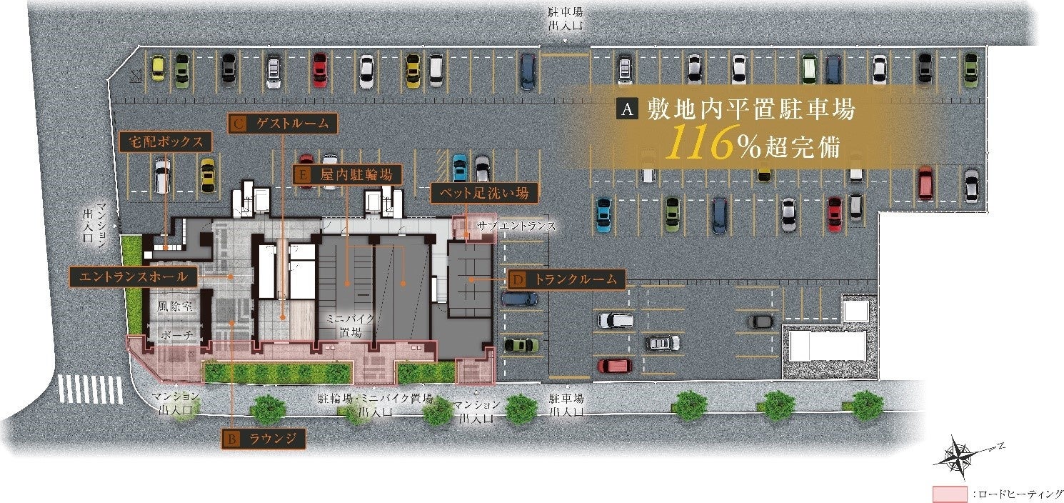 三方接道の開放的な敷地を活かし、全て平置、総戸数に対し116%超の駐車場を設置し快適なカーライフをサポートします。