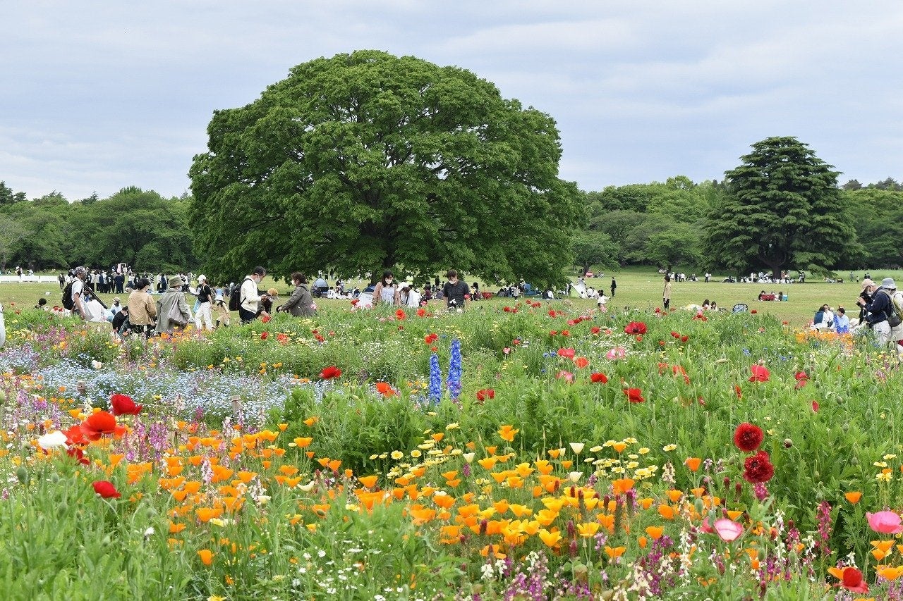 2026年5月24日(日)まで「フラワーフェスティバル2026」が開催されており、園内各所の花畑ではネモフィラやシャーレーポピーなど春の花々を楽しむことができます。