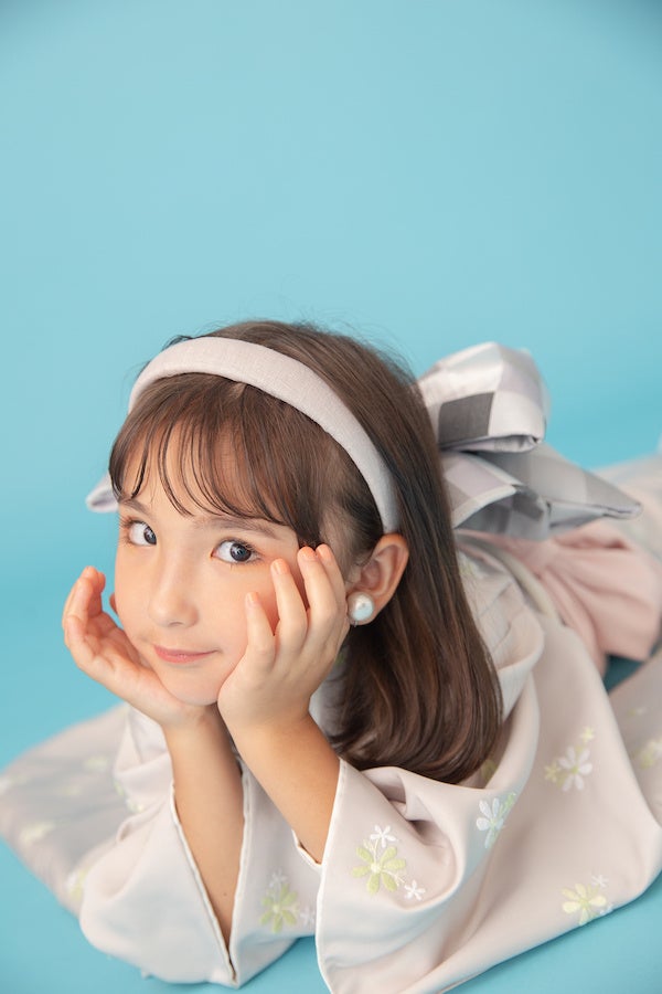 2023年の七五三は『rétro×feminine』シンプルな水色のペーパー背景に新作のグレーのお着物を合わせました。