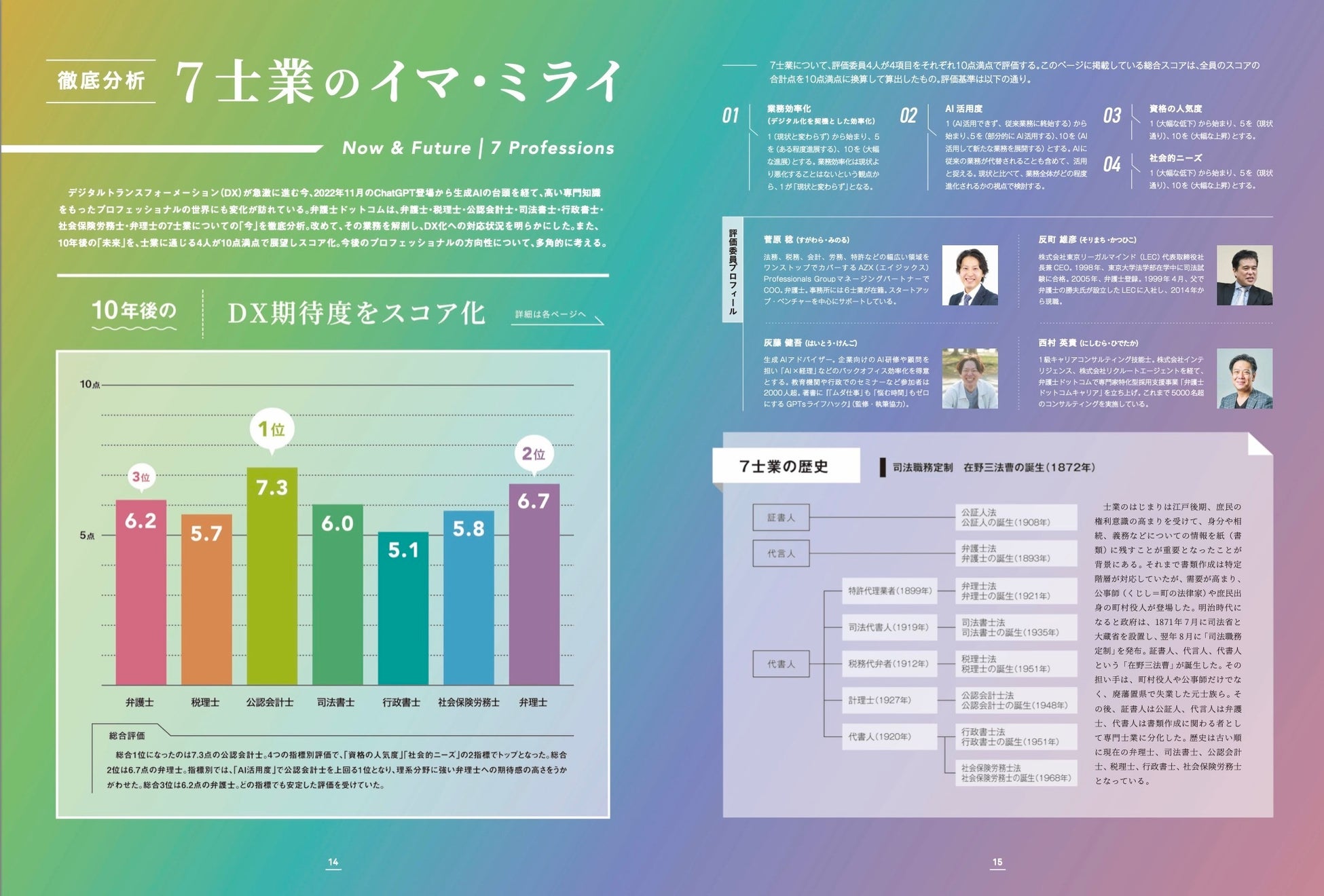 7士業を横断した、DX期待度スコアの算出、士業ごとの概要・課題分析、士業やそのユーザーのアンケート、サービス開発者インタビュー、DXサービスリストの作成など、多岐にわたり、7士業の現在と未来について、調査・分析しました。「士業の仕事がAIに代替されるのではないか」といった問題も指摘される中、どうすれば、「士業のAI活用」により、社会全体の専門知識の普及が進むのか、そのヒントになればと考えています。