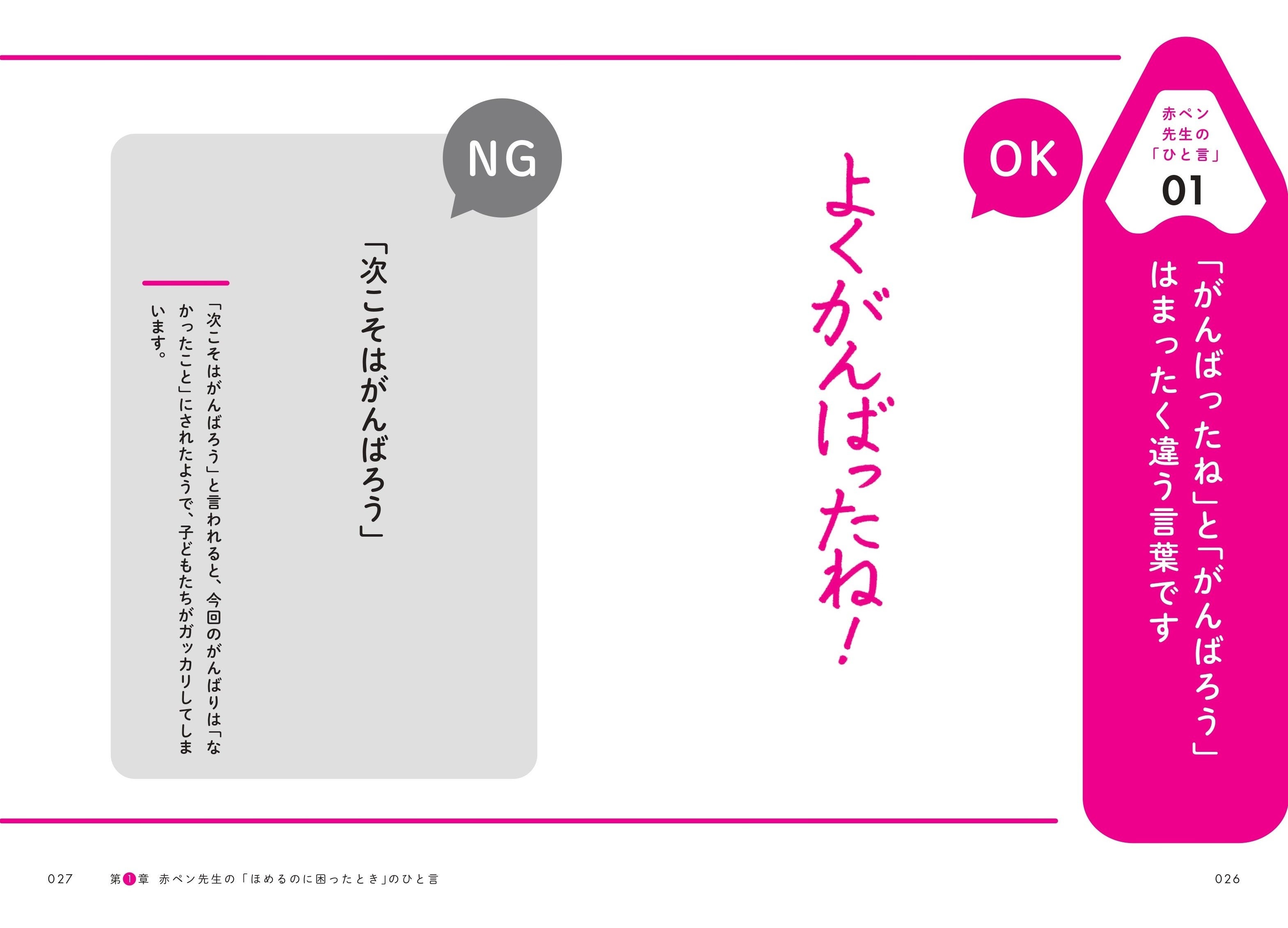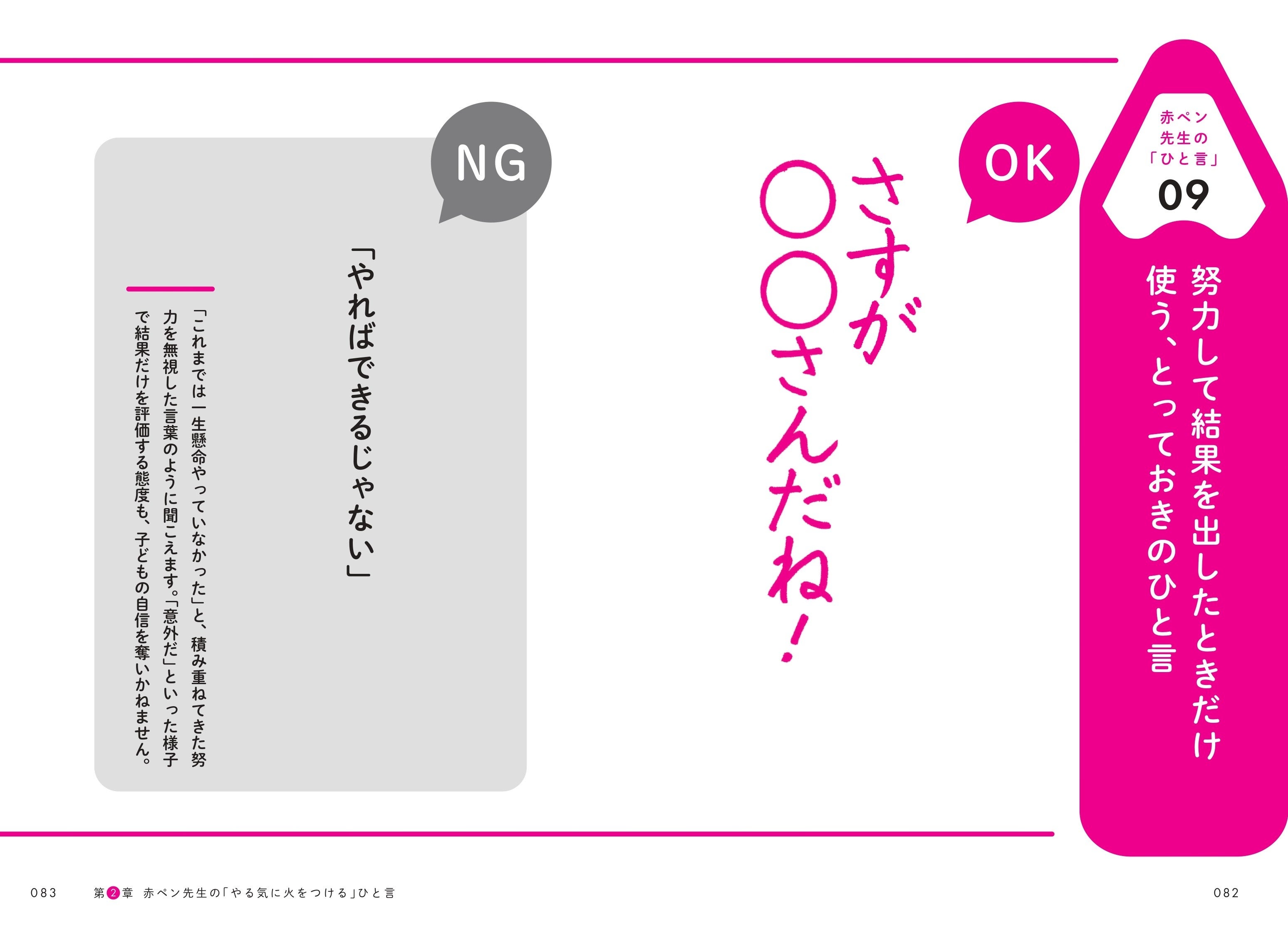 著者は、進研ゼミ「赤ペン先生」全国代表であり、20年以上にわたり8万枚以上の答案を添削指導してきた佐村俊恵氏。本書では、57年間受け継がれてきた「赤ペン先生」のほめノウハウをもとに、日常生活ですぐに使える「声のかけ方」を紹介。「チャレンジして失敗したら」「努力して成果が出たら」「めんどくさいと言われたら」など、具体的なケースを通じて、子どもの自信とやる気を引き出す「ひと言」を伝えます。