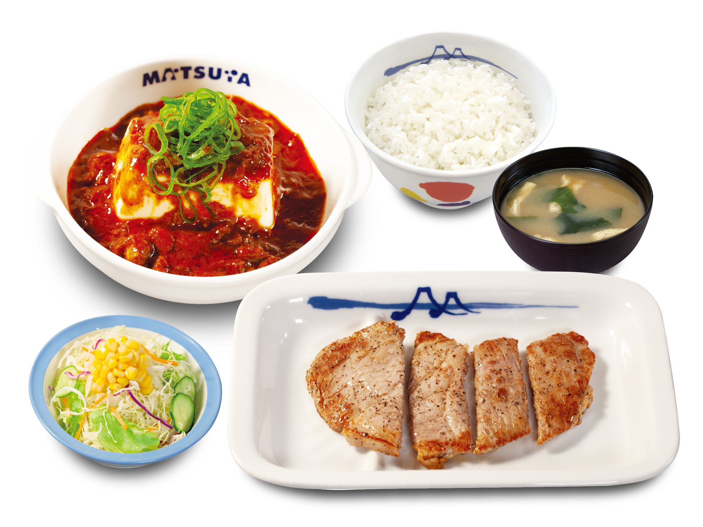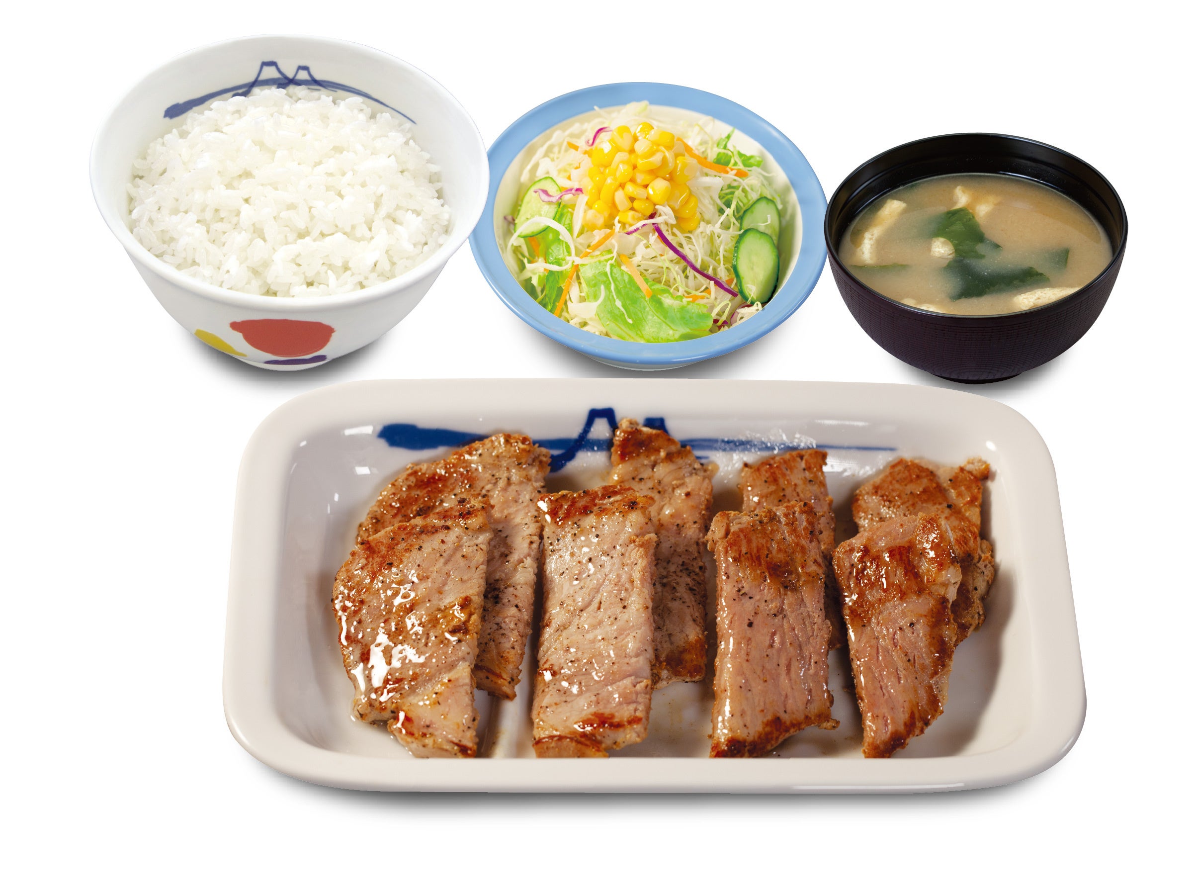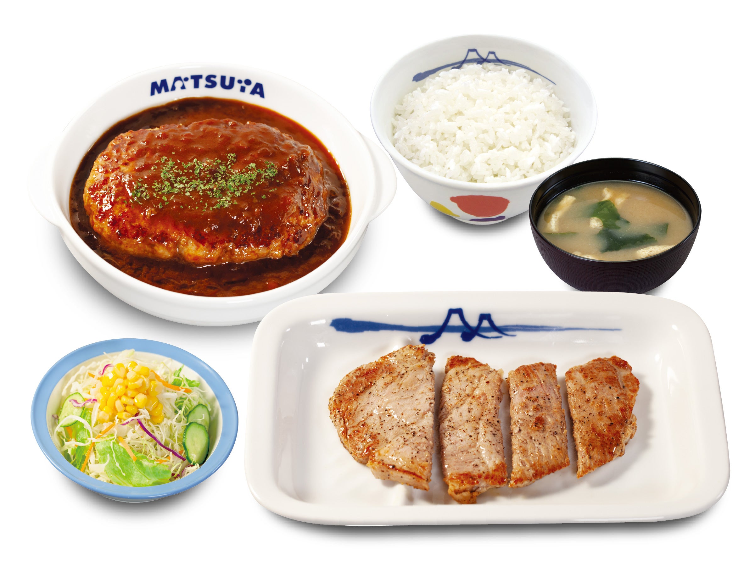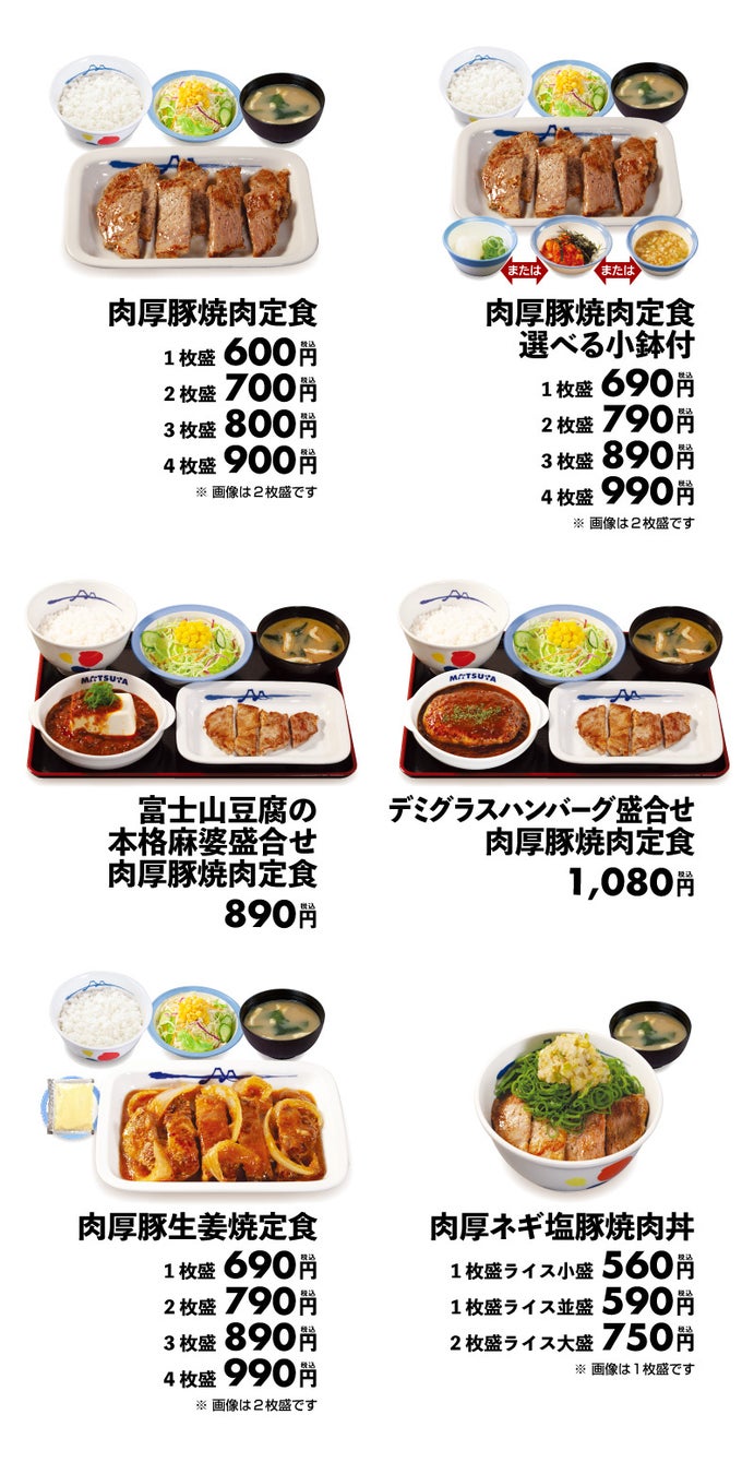 商品名 肉厚豚焼肉定食 1枚:600円 2枚:700円 3枚:800円 4枚:900円 鬼おろし 上記 +90円 のりキム 上記 +90円 ネギダレ 上記 +90円 肉厚豚生姜焼定食 1枚:690円 2枚:790円 3枚:890円 4枚:990円 富士山豆腐の本格麻婆盛合せ肉厚豚焼肉定食 890円 デミグラスソースハンバーグ盛合せ肉厚豚焼肉定食 1,080円 肉厚ネギ塩豚焼肉丼 1枚盛ライス小盛:560円/ライス並盛:590円 2枚盛ライス大盛:750円 ※お持ち帰りいただけます。お持ち帰りにみそ汁は付きません。 お持ち帰りの場合、みそ汁は別途60円でお求めいただけます。 ※税込み価格です。 発売日 2023年5月23日(火)午前10時 ~ ※「豚焼肉」終売に伴い、順次「肉厚豚焼肉」発売となりますので、発売日時は店舗により前後いたします。 ※松弁ネット、松屋モバイルオーダーでは、2023年5月23日(火)午前10時からご注文いただけます。 対象店舗 一部店舗を除く全国の松屋 |