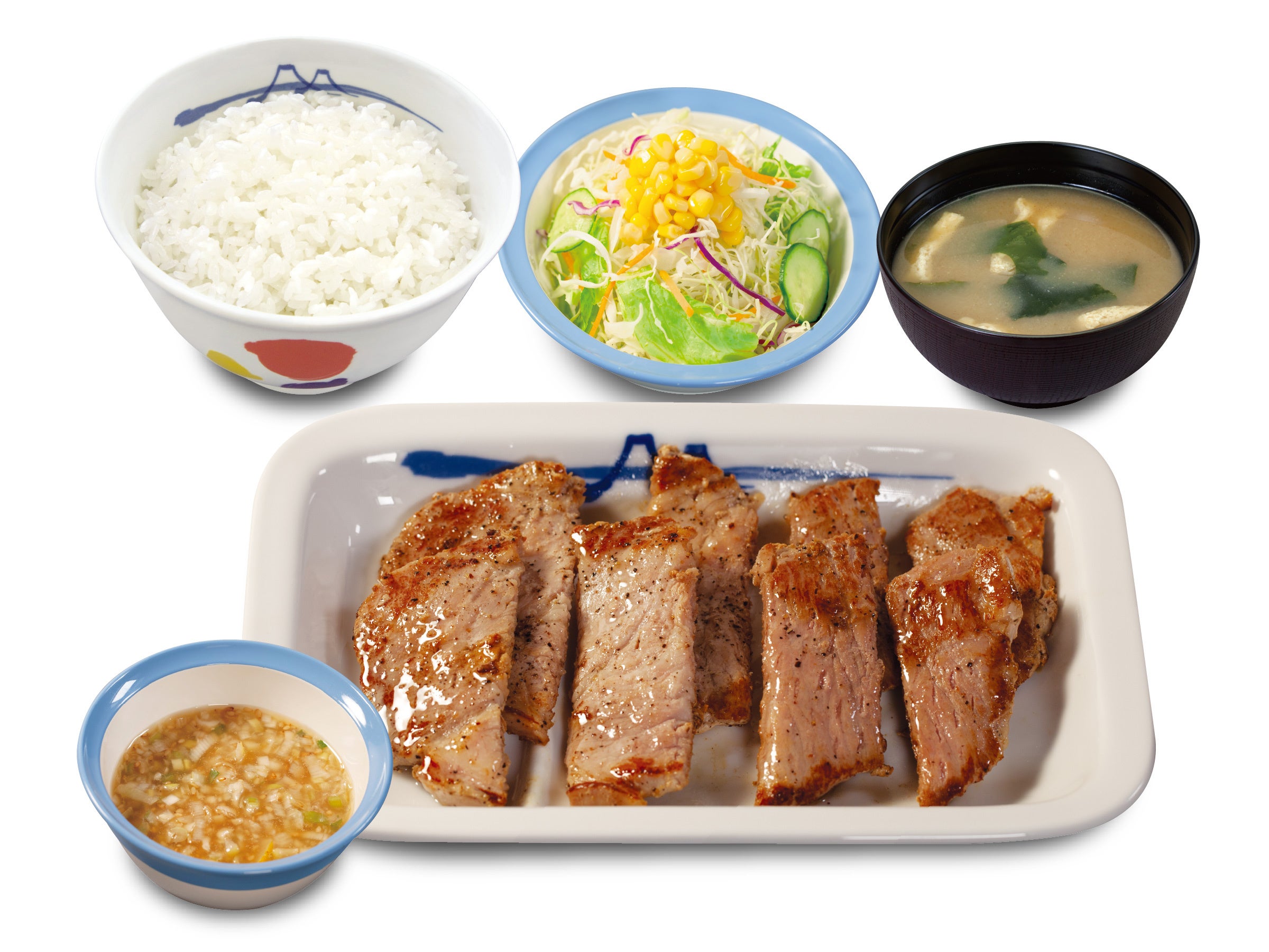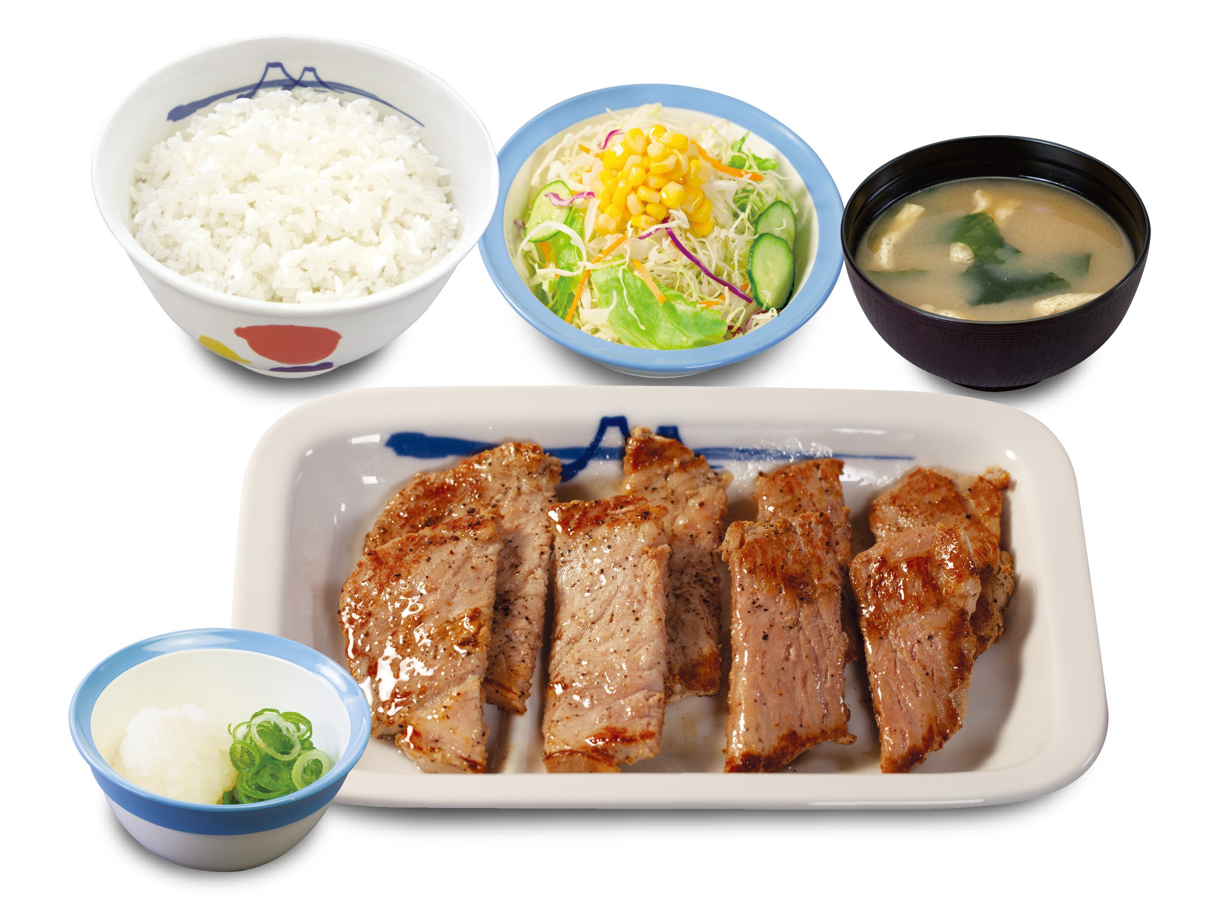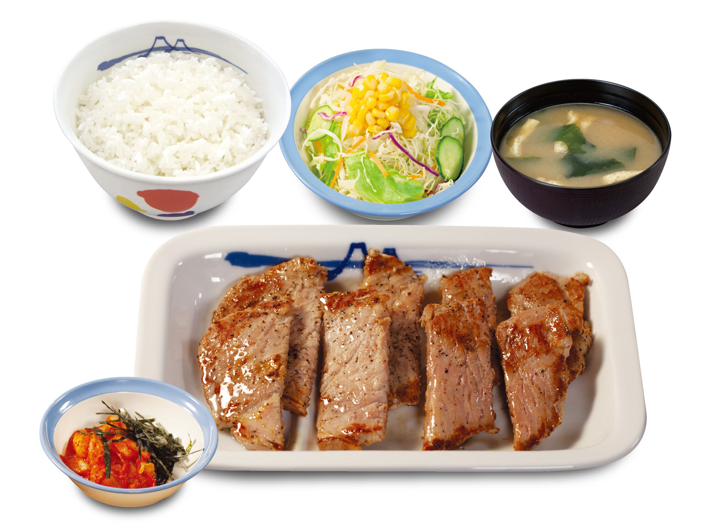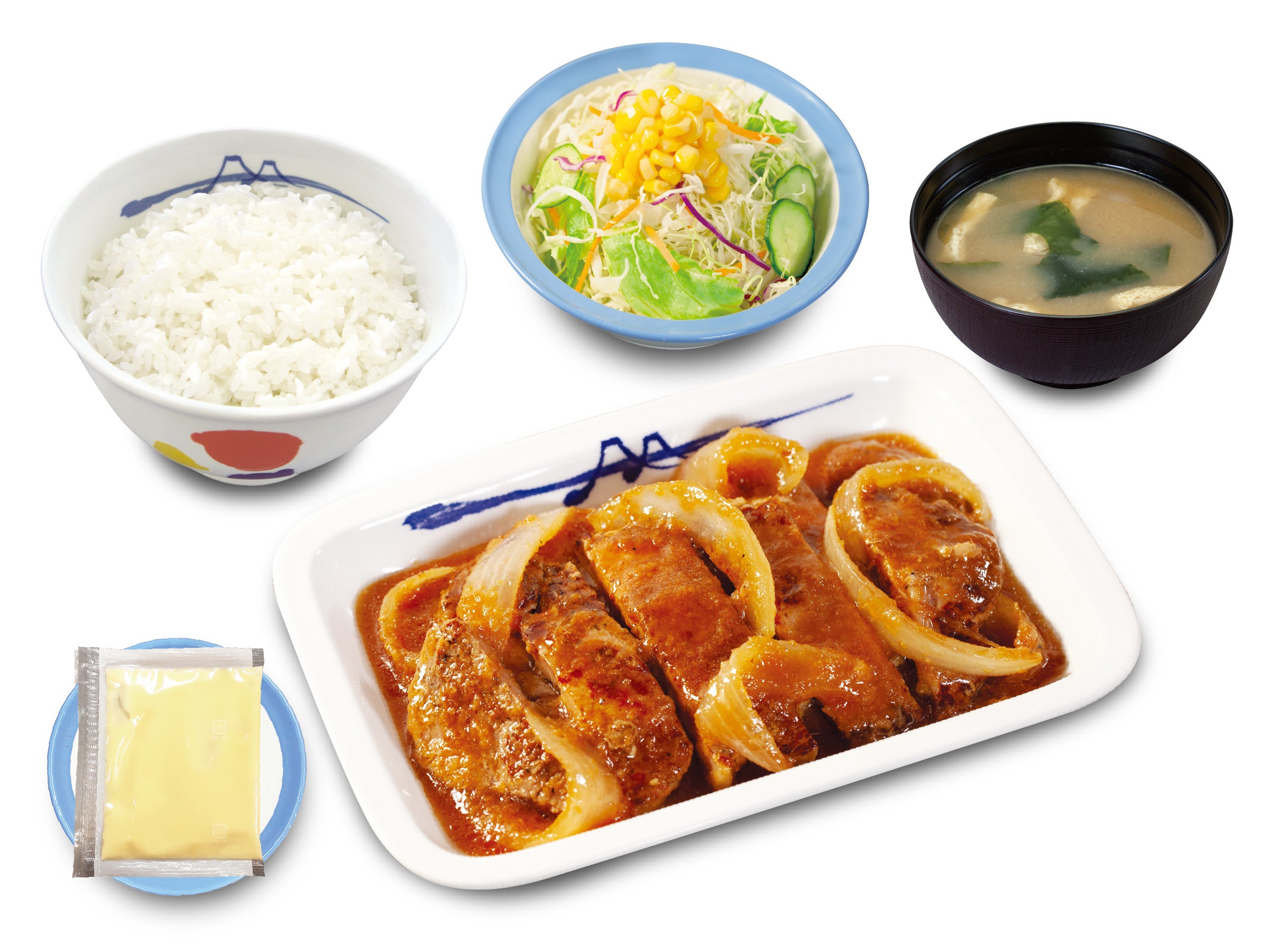 商品名 肉厚豚焼肉定食 1枚:600円 2枚:700円 3枚:800円 4枚:900円 鬼おろし 上記 +90円 のりキム 上記 +90円 ネギダレ 上記 +90円 肉厚豚生姜焼定食 1枚:690円 2枚:790円 3枚:890円 4枚:990円 富士山豆腐の本格麻婆盛合せ肉厚豚焼肉定食 890円 デミグラスソースハンバーグ盛合せ肉厚豚焼肉定食 1,080円 肉厚ネギ塩豚焼肉丼 1枚盛ライス小盛:560円/ライス並盛:590円 2枚盛ライス大盛:750円 ※お持ち帰りいただけます。お持ち帰りにみそ汁は付きません。 お持ち帰りの場合、みそ汁は別途60円でお求めいただけます。 ※税込み価格です。 発売日 2023年5月23日(火)午前10時 ~ ※「豚焼肉」終売に伴い、順次「肉厚豚焼肉」発売となりますので、発売日時は店舗により前後いたします。 ※松弁ネット、松屋モバイルオーダーでは、2023年5月23日(火)午前10時からご注文いただけます。 対象店舗 一部店舗を除く全国の松屋 |