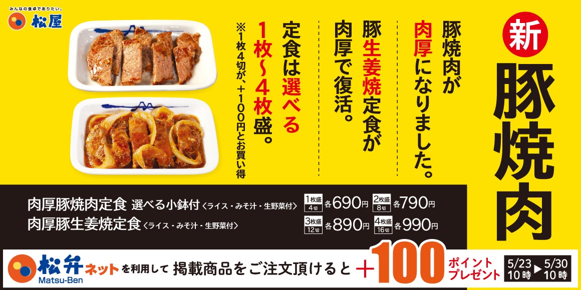 5月23日10時~5月30日10時まで、松弁ネットを利用して「肉厚豚焼肉定食」関連商品のお弁当をご注文頂けると、100ポイントプレゼントいたします。