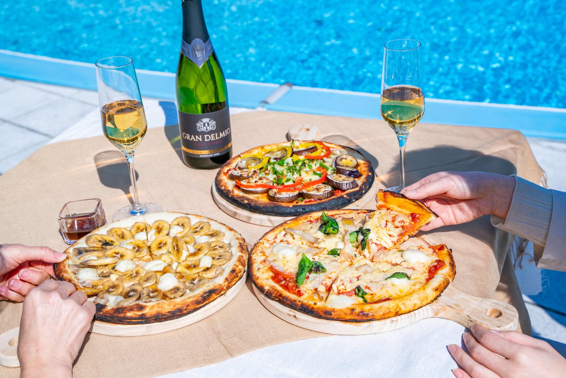 土佐備長炭について学んだ後はホテルに戻り、プールサイドでランチタイム。開放的な空間で高知県産の野菜の炭火焼やピザをお楽しみいただけます。