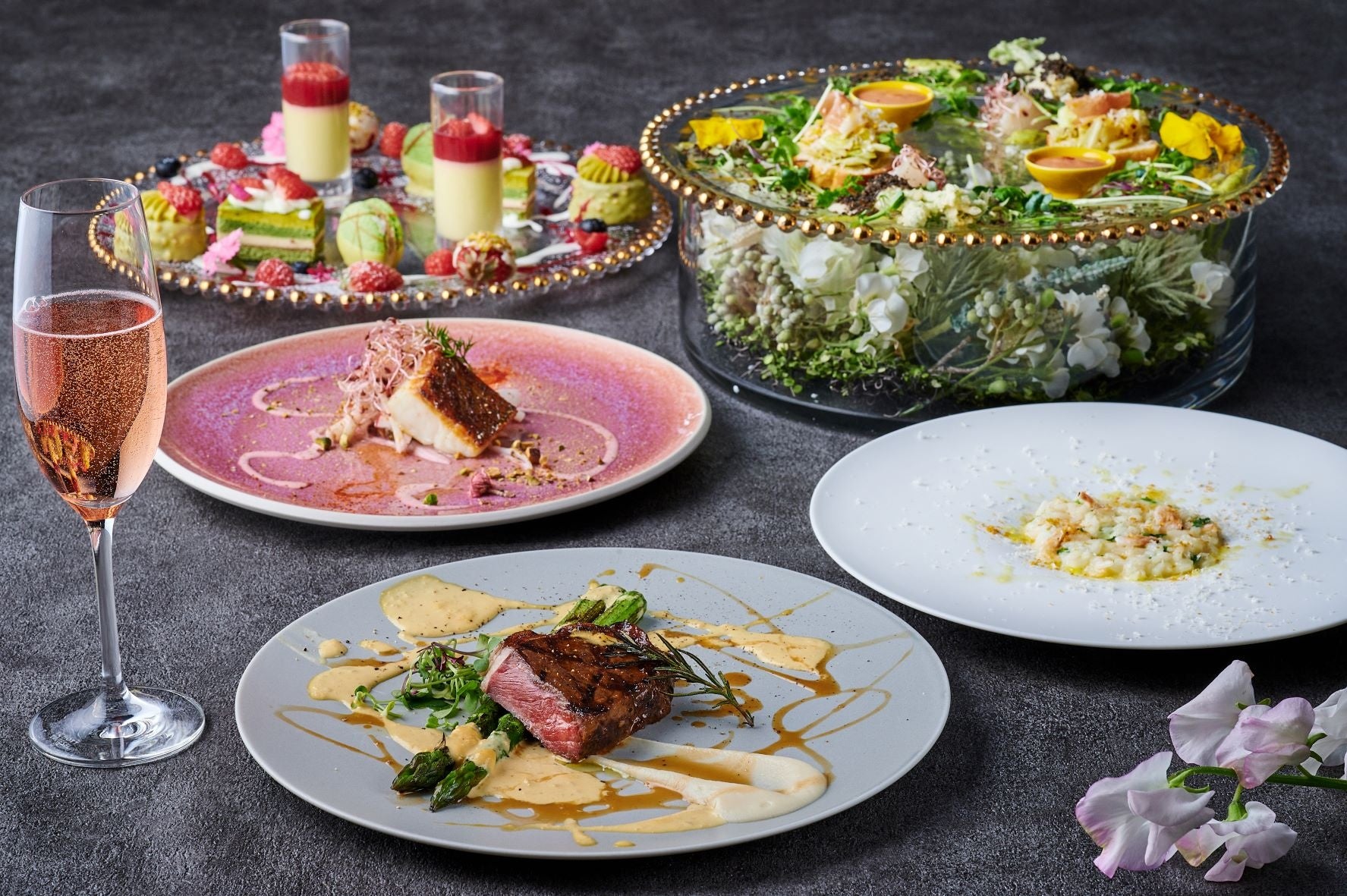 和歌山県産桜海老と菜の花のリゾットや、愛媛県産真桜鯛のローストに桜とビーツのソースをあしらった華やかな魚料理、メインには旬のアスパラガスを添えた牛サーロインのグリルを、春らしいハニーとレモンのグレイビーソースとともにお愉しみいただけます。