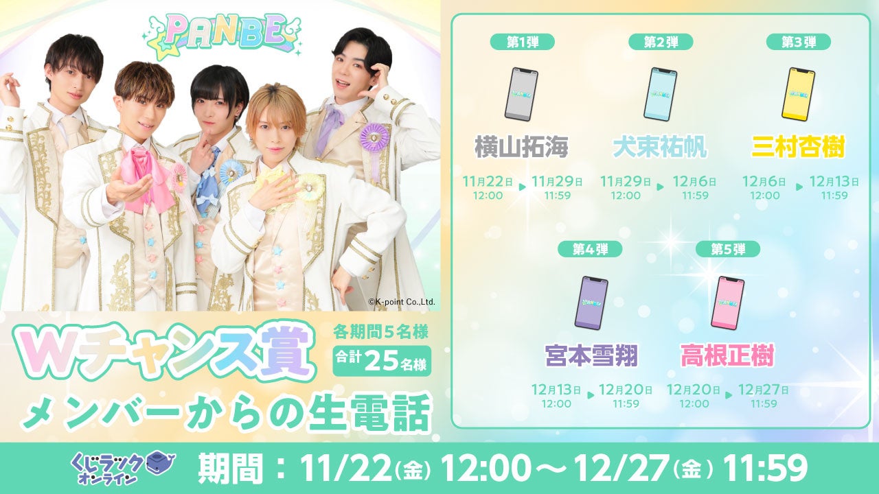 カルチュア・エンタテインメント株式会社は、ボーイズアイドルグループ「PANBE」とコラボレーションしたオンラインくじ「くじラックオンライン」を2024年11月22日(金)より販売いたします。A賞のオリジナルイベントご招待をはじめ、各メンバー写真がデザインされた素敵なグッズがハズレなしでゲットできます。さらに、くじ1枚ご購入ごとにWチャンス賞の抽選が行われ、当選した方は特別な賞品が獲得できます。
