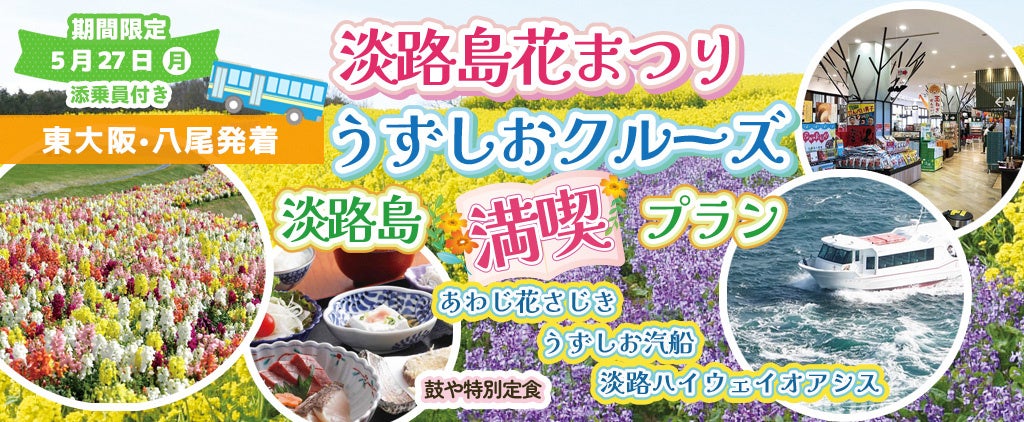 お一人様13,800円!〈東大阪・八尾 発着〉5月27日(月) 『淡路島花祭り+うずしおクルーズ』淡路島満喫プラン!!〈添乗員付き〉日帰りバスツアーのオンライン販売を開始しました。