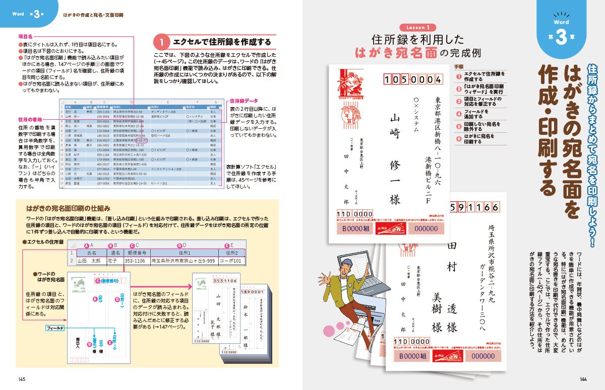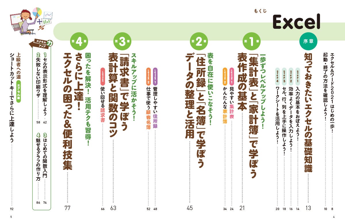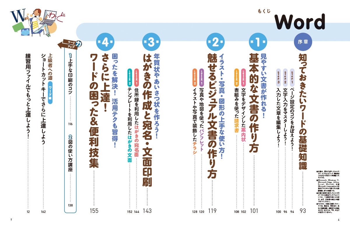 エクセル編では、「集計表」「家計簿」「住所録」「名簿」「請求書」といった使用頻度の高い各種表組の作成方法を紹介。また、ワード編では、「案内状」「請求書」「パンフレット」「チラシ」「はがき」といった文書の作り方をレクチャーしています。