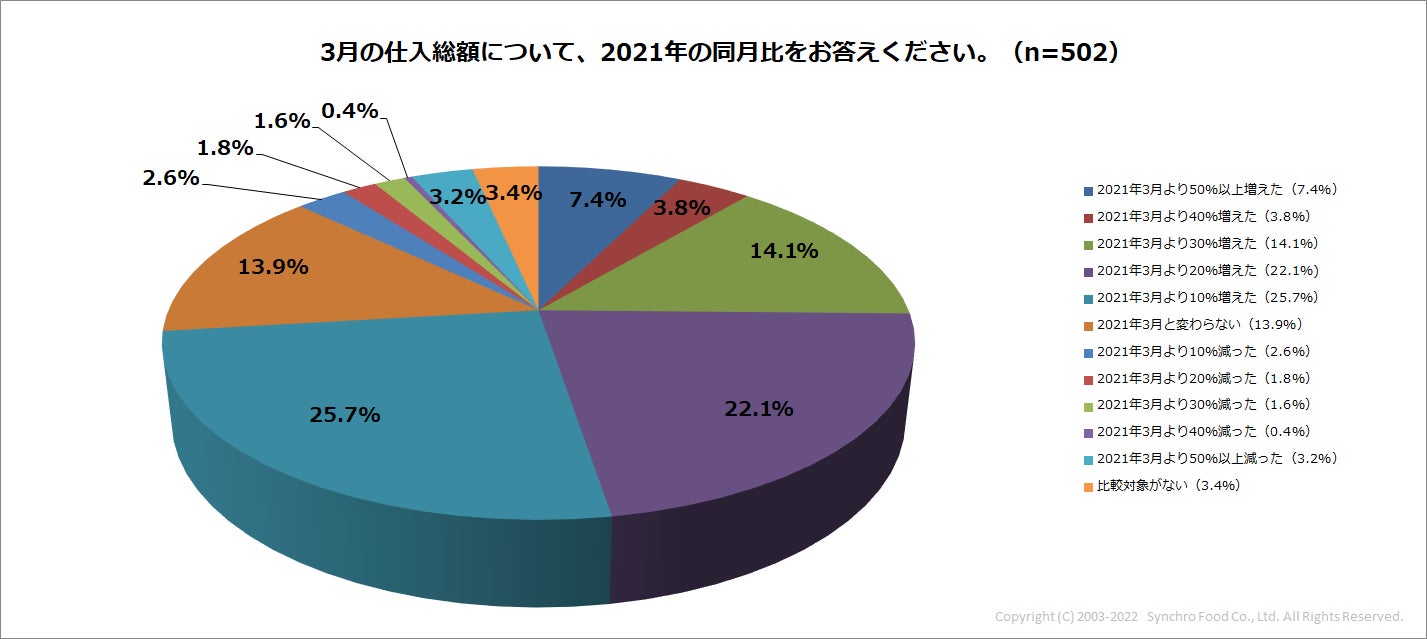 昨年3月と比べた今年3月の仕入総額を伺うと、約60%の店舗が「10%~30%増えた」と回答。さらに10%以上の店舗が「40%以上増えた」と回答していることからも、価格高騰が仕入状況に大きく関係している様子がうかがえます。