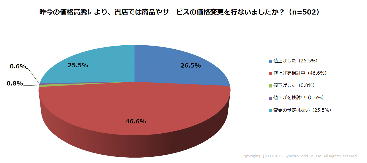 しかし価格高騰による商品やサービスの価格変更についての質問では、「値上げした」という回答は26.5%。最も多かったのは「値上げを検討中(46.6%)」となり、73%以上の店舗が現状では値上げをしていないことがわかりました。