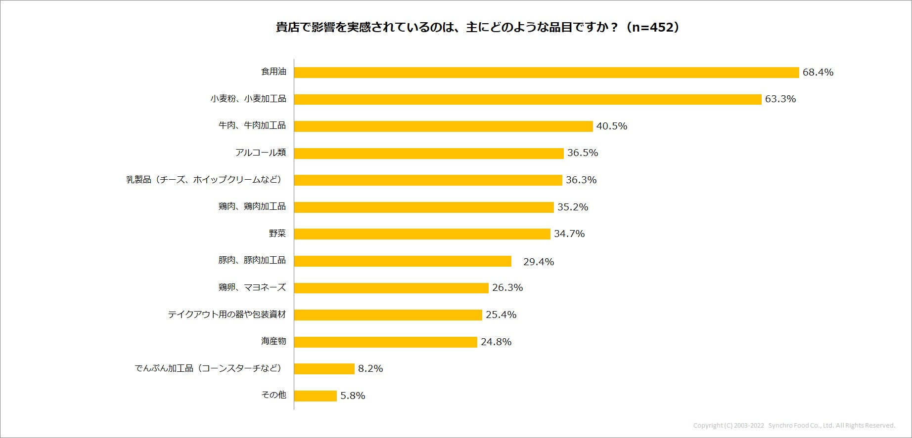 次に「影響している」、「やや影響している」と回答した店舗に、価格が高騰している品目を聞いてみると、「食用油」が最も多い68.4%。次いで「小麦粉、小麦加工品」が63.3%。さらに「牛肉・牛肉加工品」、「アルコール類」、「乳製品」、「鶏肉・鶏肉加工品」、「野菜」がすべて30%以上で続きました。