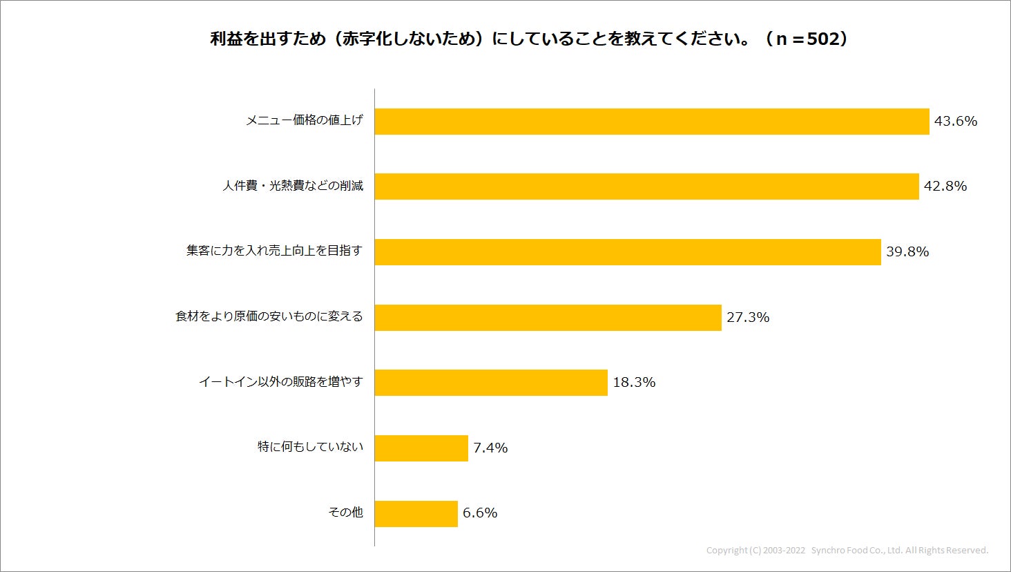 次に利益を出すために実施している対策について聞いたところ、「メニュー価格の値上げ」が最も多く、43.6%。次いで「人件費・光熱費などの削減」が42.8%。さらに「集客に力を入れて売上向上を目指す(39.8%)」、「食材をより原価の安いものに変える(27.3%)」と続きました。