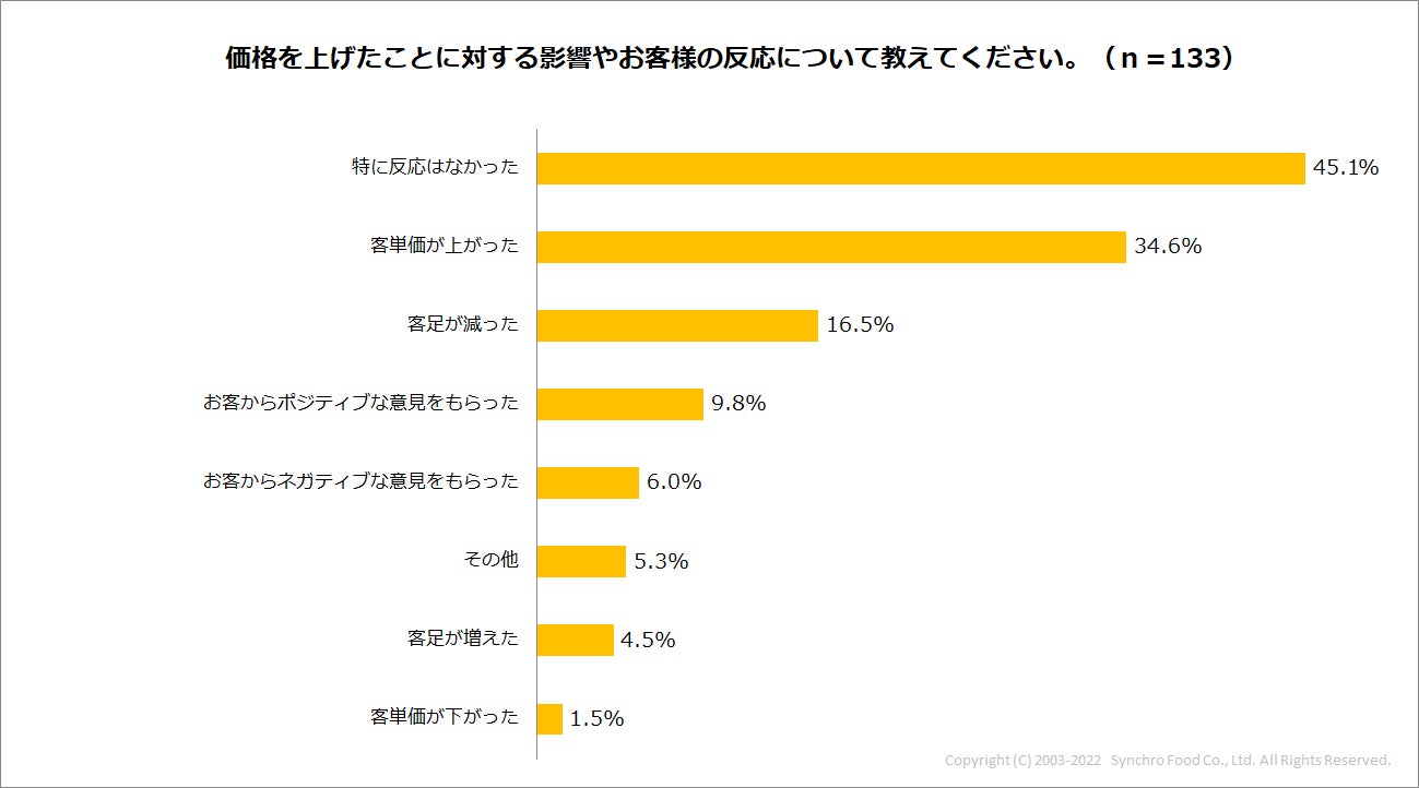 さらに「値上げした」と回答したお店に、その影響を聞いてみると、最も多かったのは「特に反応はなかった(45.1%)」だったものの、34.6%は「客単価が上がった」と回答しました。一方で「客足が減った(16.5%)」、「お客からネガティブな意見をもらった(6%)」というマイナスの影響をあげる声も22.5%ありました。