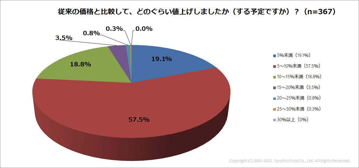 また「値上げをした」、「値上げを検討中」と回答した方に、どれくらい値上げしたか(または値上げする予定か)を質問すると「5%から10%未満」との回答が最も多く、57.5%。集計すると、76.6%の店が「10%未満」の値上げを行う意向であることがわかりました。
