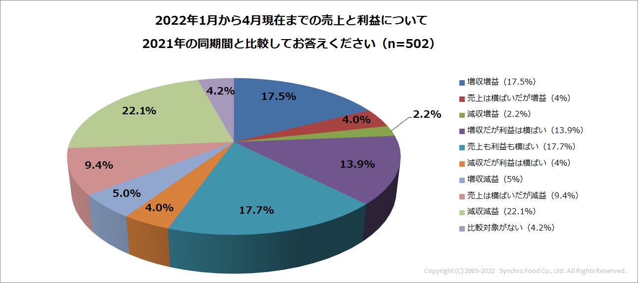 今年の1月から4月までの売上と利益について、昨年同期間と比較してもらったところ、最多の回答は「減収減益」で、22.1%。続いて、「売上も利益も横ばい(17.7%)」、「増収増益(17.5%)」、「増収だが利益は横ばい(13.9%)」となりました。仕入総額が増えるなか、集計すると23.7%が「増益」だったこともわかります。