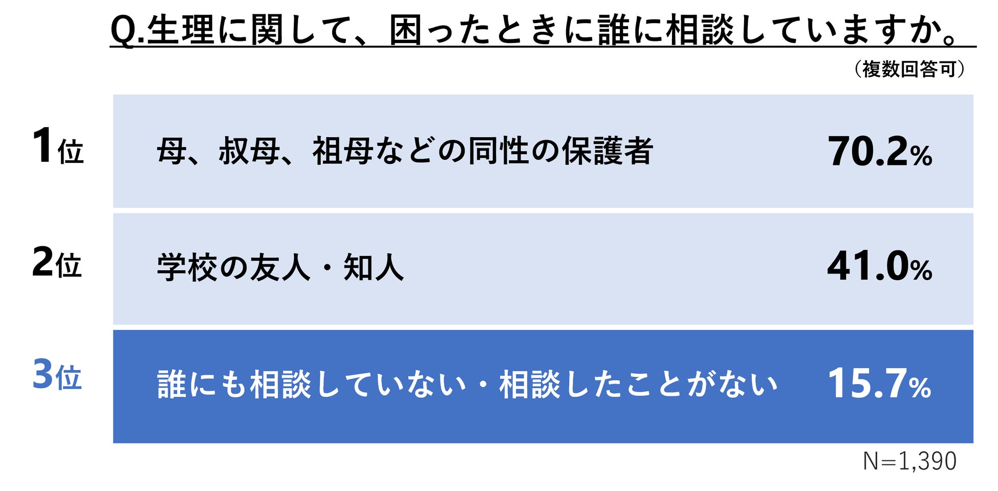 生理に関して、「困ったときに誰に相談しているか」を尋ねたところ、7割が「母、叔母、祖母などの同性の保護者(70.2%)」に頼っていると回答。次いで「学校の友人・知人(41.0%)」という結果になりました。その一方で、「誰にも相談していない・相談したことがない(15.7%)」という声も上がっており、6人に1人は困ったときに相談できる相手がいないという現状が明らかになりました。