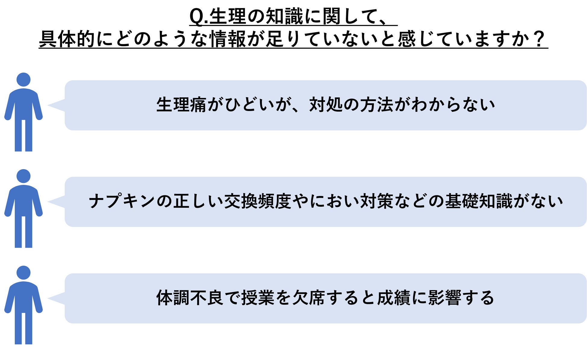 生理に関する知識は十分に足りているかを尋ねたところ、「十分に足りている」と答えた人はわずか12.7%。どのような情報が足りていないかを尋ねる質問には、「痛みや出血がひどいときにどのタイミングで病院に行けば良いのかわからない」「自分の生理周期や経血量が正常なのかわからない」との声が多く寄せられました。