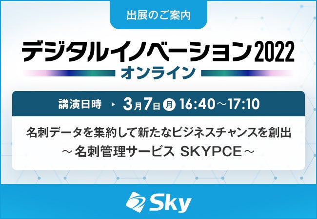 Sky株式会社は、3月7日(月)~ 3月11日(金)(延長展示:3月12日(土)~3月31日(木))にオンラインイベントとして開催される「デジタルイノベーション 2022 オンライン」に出展いたします。