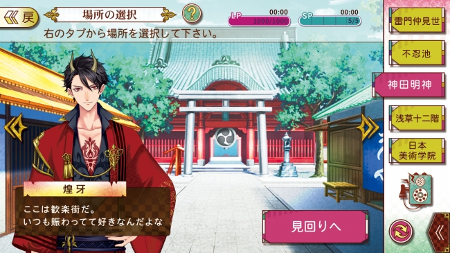 ボルテージ最新作「あやかし恋廻り」のゲームシステムの一つである“見回り”機能のゲーム画面です。 従来の恋愛ドラマアプリとは異なる新しいゲームシステムをお楽しみいただけます。