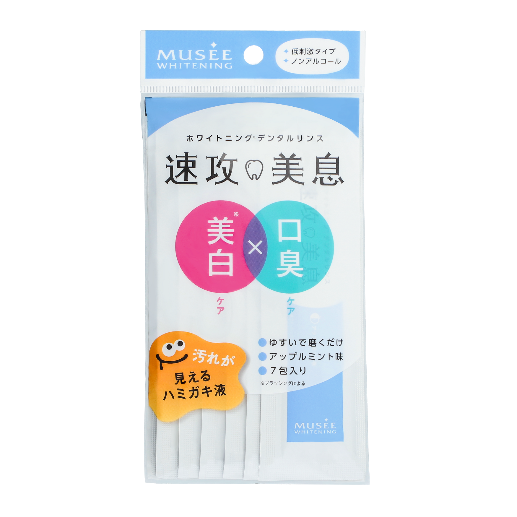 このたび、新発売する「速攻美息(デンタルリンス)」は、歯磨きでは落としきれなかった汚れや口臭の原因となるたんぱく質を固めて洗い流します。さらに、ホワイトニング成分配合で、白い歯(※5)にアプローチ。低刺激タイプなので、刺激が苦手な方にもおすすめです。また、持ち運びに便利で衛生的な個包装タイプなので、外出先での口腔ケアや食後のケアなど、さまざまなシーンでご利用いただけます。