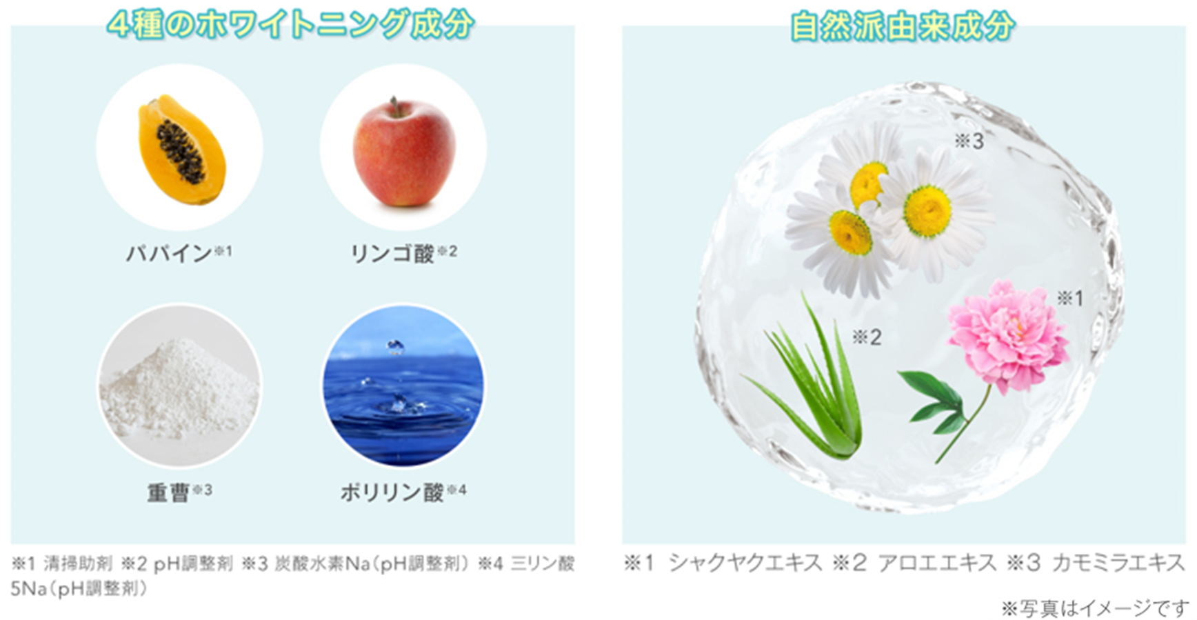 ②厳選された4種のホワイトニング成分(パパイン(清掃助剤)、リンゴ酸(pH調整剤)、重曹(炭酸水素Na(pH調整剤))、ポリリン酸(三リン酸5Na(pH調整剤)))と、6種の自然派由来成分(シャクヤクエキス、オトギリソウエキス、ハマリスエキス、トウキンセンカエキス、アロエエキス、カモミラエキス)配合で、白い歯(※5)と口内環境にアプローチします。