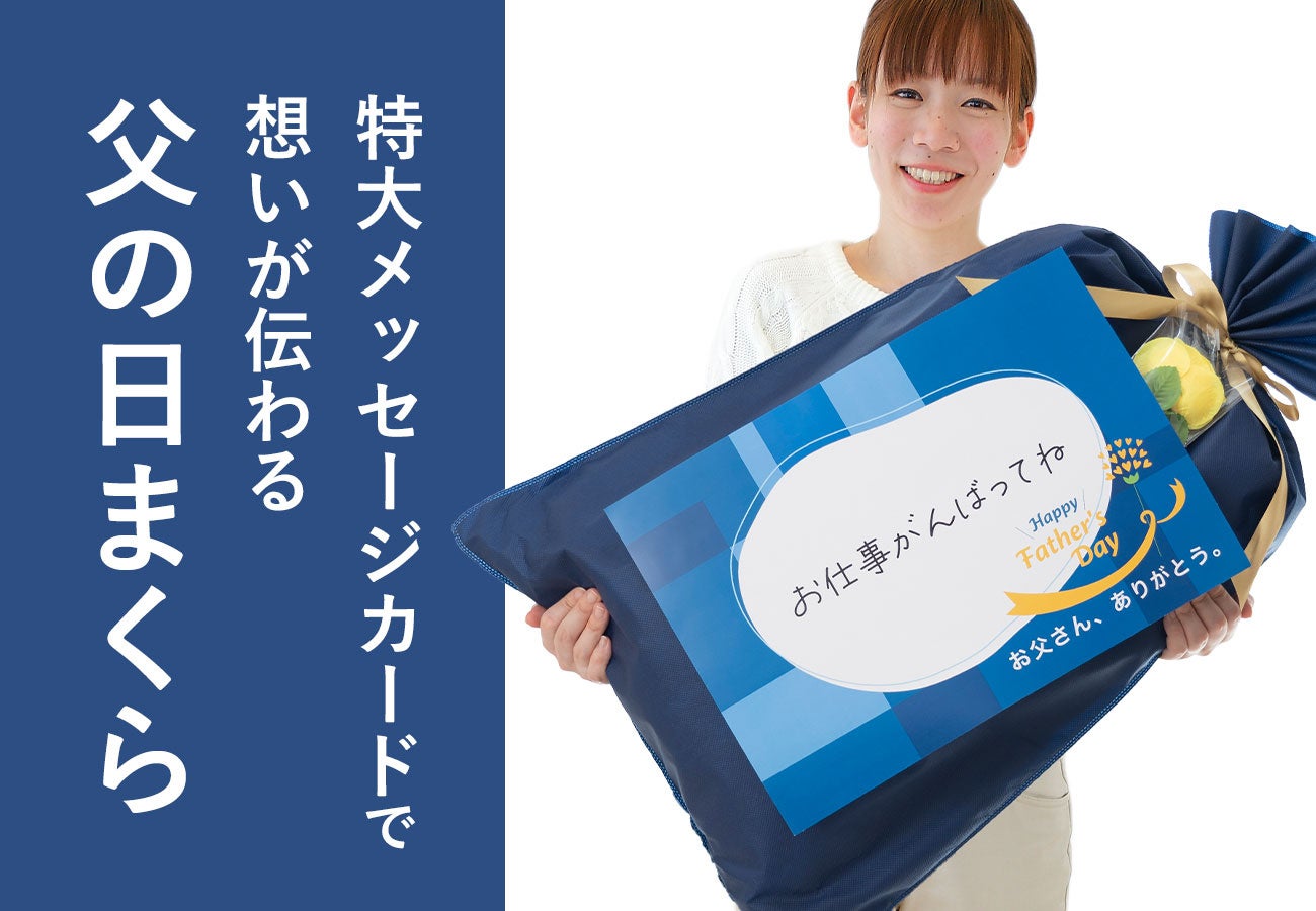 感謝の気持ちをしっかり伝えたいなら、父の日まくら。特大メッセージ付きで、照れくさい気持ちもしっかり伝わります。10種類のメッセージから選べ、気持ちを代弁。使いやすい枕と専用カバー、心温まるメッセージカードの特別セットです。