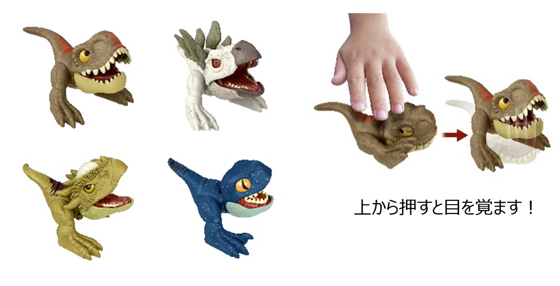 『ジュラシック・ワールド』の恐竜達のかわいいフィギュアです。眠っている恐竜を上から押すと、恐竜が目を覚まします。