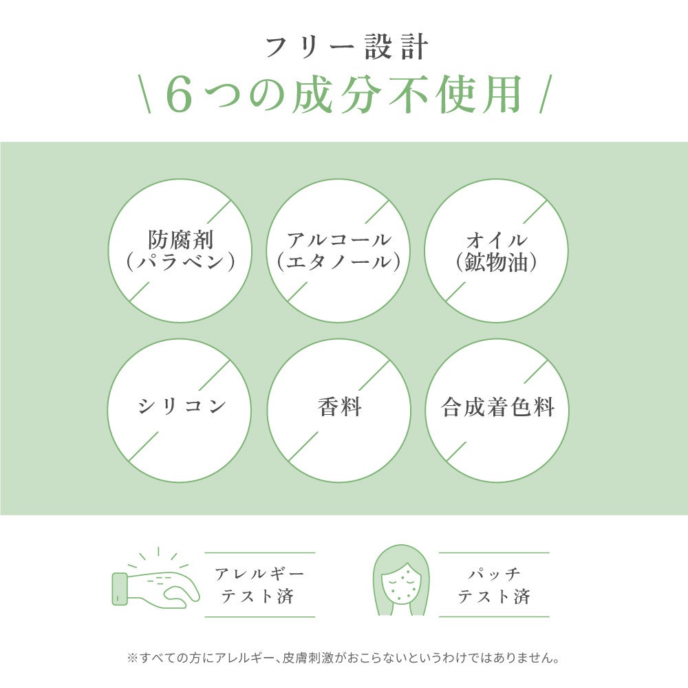 オイルやアルコールなど6つの成分を不使用としたフリー設計※5にこだわっています。また、アレルギーテスト・パッチテストの2つの肌テストを実施済みです。