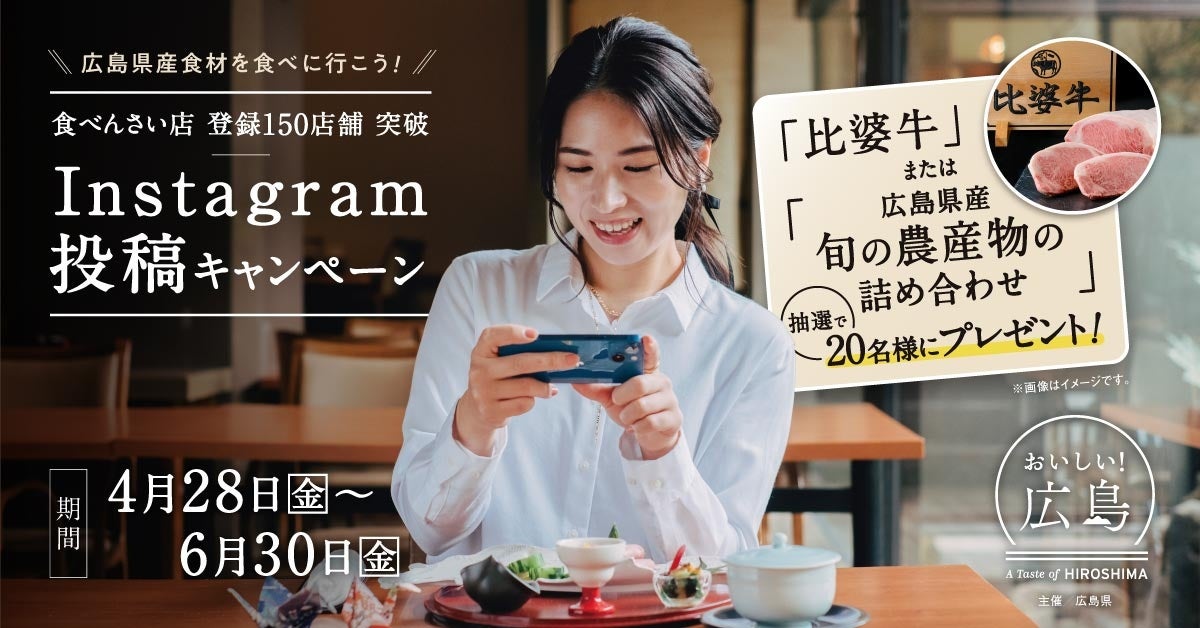 この度,県産品を積極的に活用したメニューや商品を提供する「おいしい!広島 食べんさい店」の登録店舗数が150店舗を突破したことを記念し,Instagramを活用して20名様に,比婆牛 または 広島県産旬の農産物詰め合わせセット(各10名様)をプレゼントするキャンペーンを実施いたしますので,是非,取材いただきますようお願いします。