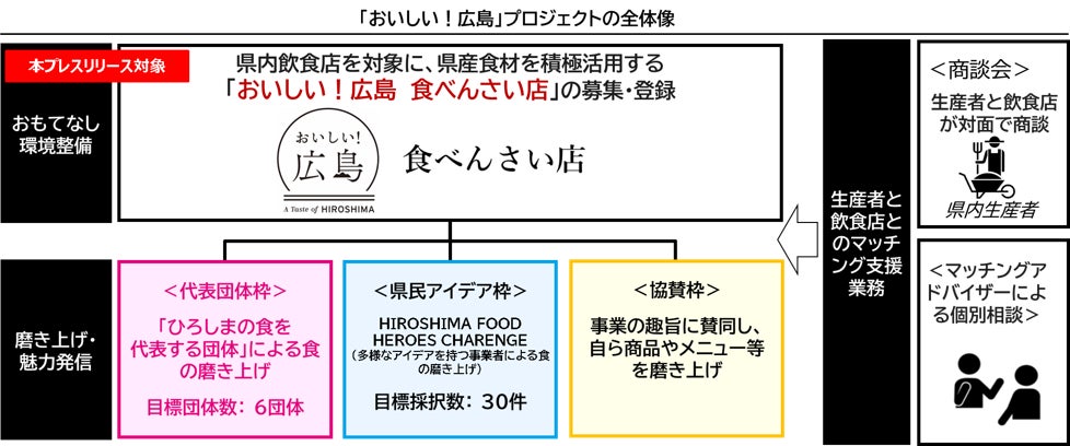 県では,県産農林水産物の販路・消費拡大を目的として,今年5月に開催されるG7広島サミットを契機に,多彩な食資産を多様な主体と磨き上げるとともに,その魅力を発信をする,「おいしい!広島」プロジェクト(以下、「本プロジェクト」)を推進しています。