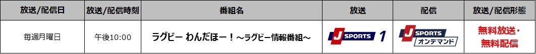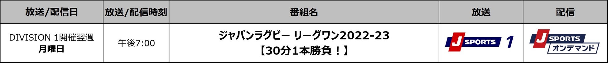 また、 ジャパンラグビー リーグワン関連番組にも注目です。「ラグビー わんだほー!~ラグビー情報番組~」は、リーグワン2年目シーズン中の間、無料で放送・配信いたします。毎週(月)午後10:00からラグビー最新情報満載でお届けします。さらには、1試合を30分で振り返る「ジャパンラグビー リーグワン2022-23【30分1本勝負!】」は、DIVISION 1の全試合を放送・配信いたします。試合が多い中で視聴時間が足りない方におすすめです。