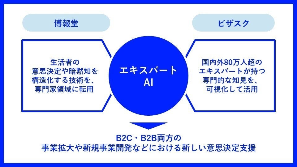 このたびの資本業務提携では、新規事業開発や市場参入・マーケティング戦略立案に取り組む企業の担当者に向けて、ビザスクのエキスパートが持つ業界特有の常識や視点と、博報堂が培ってきた意思決定の思考構造化のノウハウおよびAIエンジンを組み合わせたAIサービス「エキスパートAI」を共同開発します。