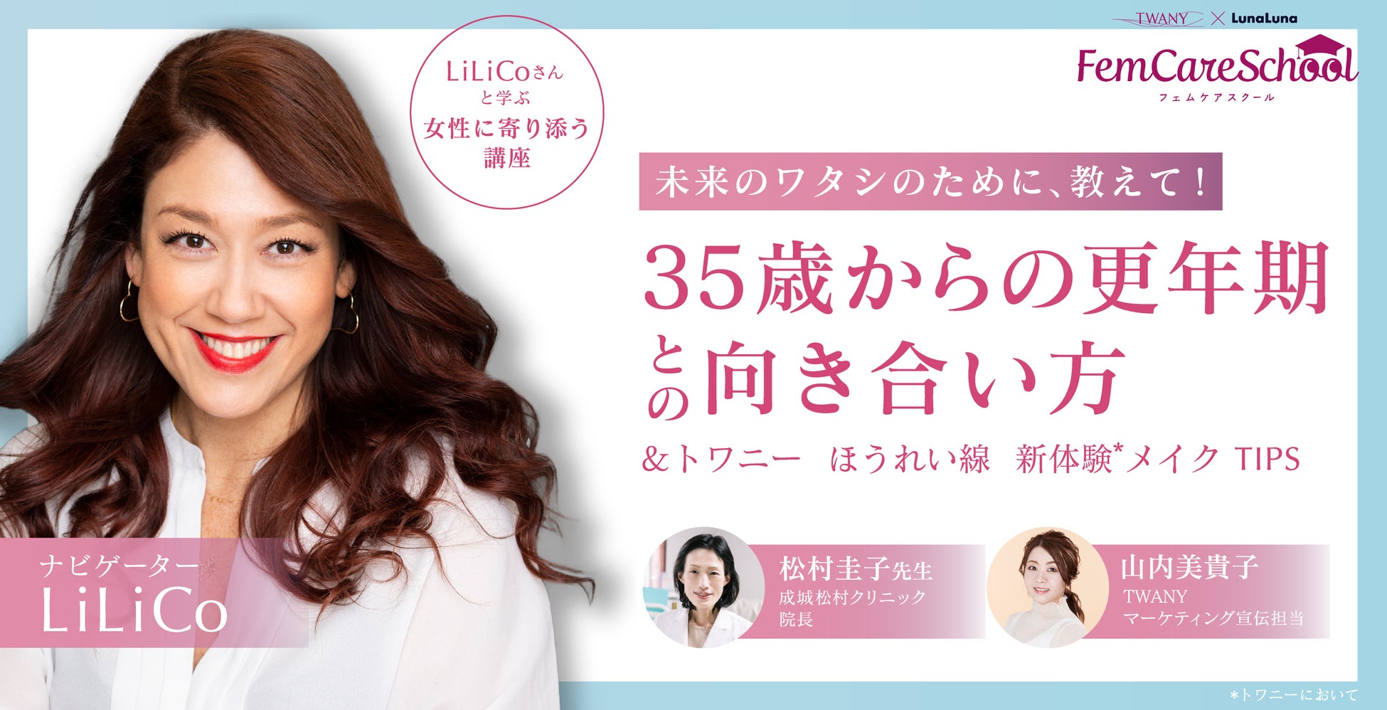 カウンセリングブランド「TWANY(トワニー)」は、女性の健康情報サービス「ルナルナ」(株式会社エムティーアイ運営)とコラボレーションし、「フェムケアスクール」と題し、美と健康の視点から正しい知識を学べる場を提供する講座を開設しています。この度、2022年10月13日(木)より、フェムケアスクールの第3弾として、更年期への準備と対処法、ほうれい線を目立ちにくくするトワニー最新のほうれい線メイクアイテムを紹介する動画を新たに公開いたします。また、女性のウェルネス課題の解決・支援事業を行うfermata(フェルマータ)株式会社が主催し、10月14日~16日の3日間、六本木にて開催される、世界最大級のフェムテックイベント「Femtech Fes! 2022」にブースを出展いたします。