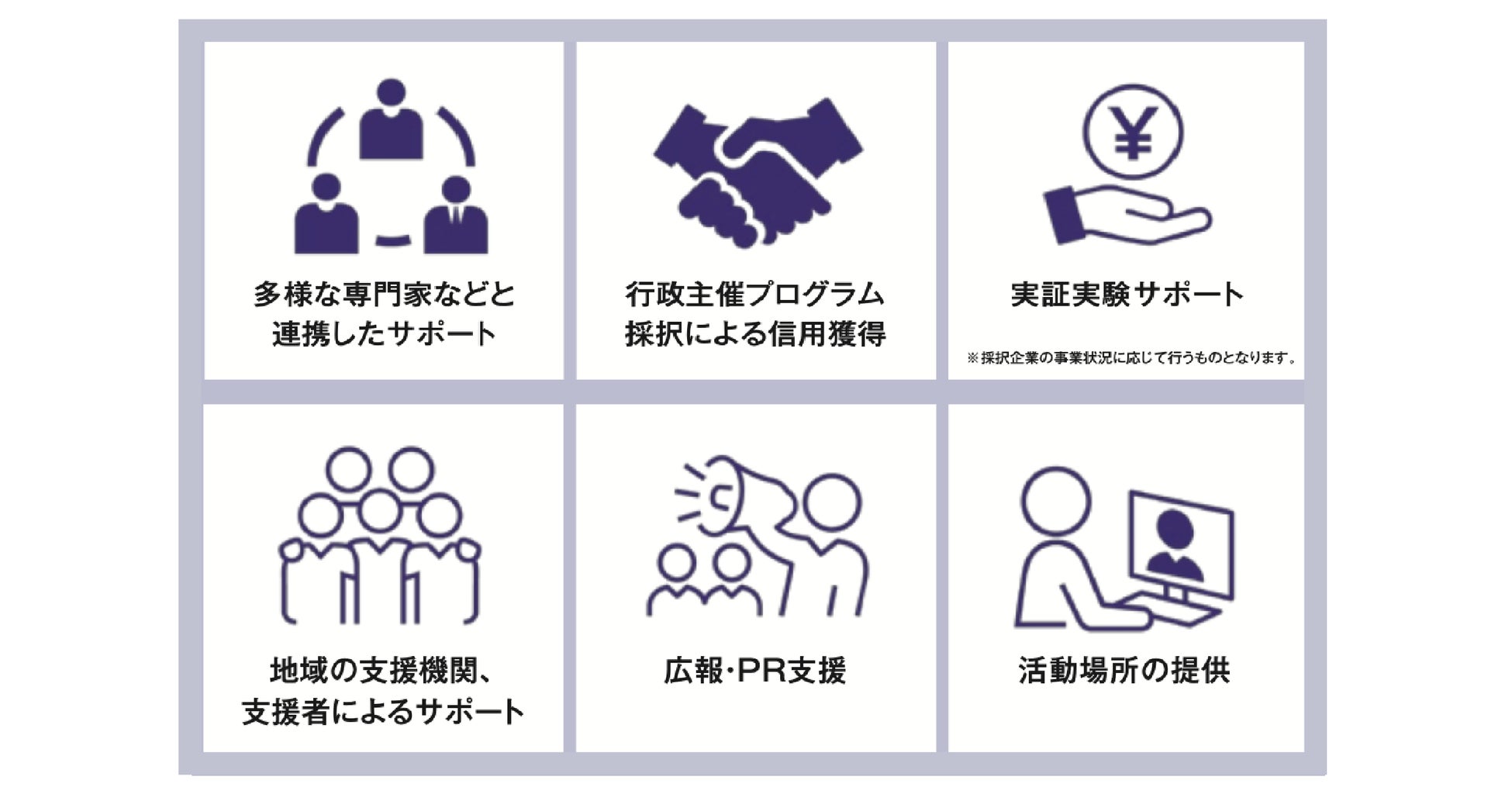 ※上記以外では、事業ステージ、ご年齢、性別、国籍等の制限もございません。ご応募の時点で法人登記をされていない方、第二創業、社内での新規事業立ち上げ等でのご応募も可能です。